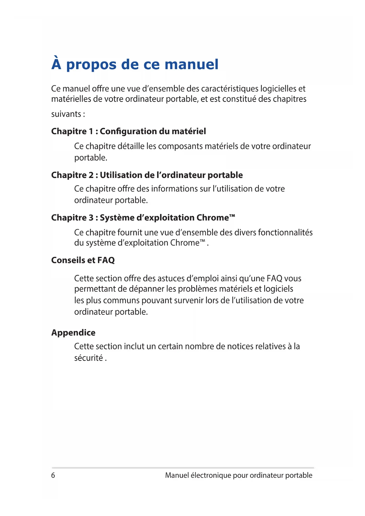 Ce chapitre fournit une vue d’ensemble des divers fonctionnalités du système d’exploitation Chrome™ . Conseils et FAQ Cette section ore des astuces d’emploi ainsi qu’une FAQ vous permettant de dépanner les problèmes matériels et logiciels les plus communs pouvant survenir lors de l’utilisation de votre ordinateur portable. Appendice Cette section inclut un certain nombre de notices relatives à la sécurité .Manuel électronique pour ordinateur portable