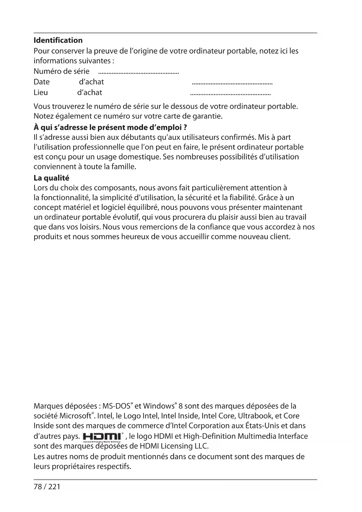 99444 P7632 Aldi BE_LUX_ML MSN 4005 1934 Content final.indb 7799444 P7632 Aldi BE_LUX_ML MSN 4005 1934 Content final.indb 77 24.11.2014 09:25:5224.11.2014 09:25:5278 / 221 Identification Pour conserver la preuve de l’origine de votre ordinateur portable, notez ici les informations suivantes : Numéro de série ................................................ Date d’achat ................................................ Lieu d’achat ................................................ Vous trouverez le numéro de série sur le dessous de votre ordinateur portable. Notez également ce numéro sur votre carte de garantie. À qui s’adresse le présent mode d’emploi ? Il s’adresse aussi bien aux débutants qu’aux utilisateurs confirmés. Mis à part l’utilisation professionnelle que l’on peut en faire, le présent ordinateur portable est conçu pour un usage domestique. Ses nombreuses possibilités d’utilisation conviennent à toute la famille. La qualité Lors du choix des composants, nous avons fait particulièrement attention à la fonctionnalité, la simplicité d’utilisation, la sécurité et la fiabilité. Grâce à un concept matériel et logiciel équilibré, nous pouvons vous présenter maintenant un ordinateur portable évolutif, qui vous procurera du plaisir aussi bien au travail que dans vos loisirs. Nous vous remercions de la confiance que vous accordez à nos produits et nous sommes heureux de vous accueillir comme nouveau client. Marques déposées : MS-DOS