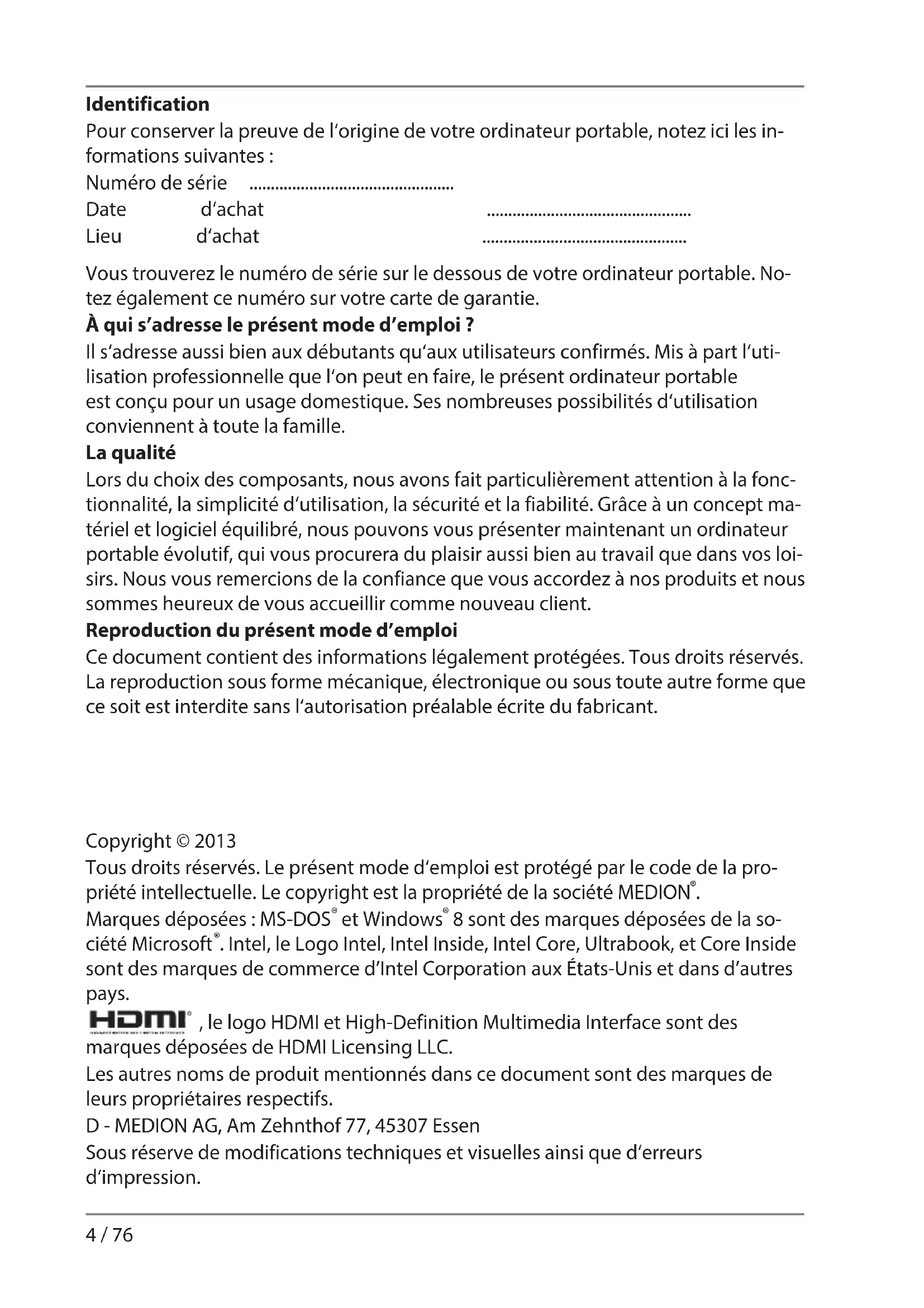 99230 E6234 Aldi BE_FR RC1 Content.indd 399230 E6234 Aldi BE_FR RC1 Content.indd 3 03.06.2013 11:12:4803.06.2013 11:12:484 / 76 Identification Pour conserver la preuve de l‘origine de votre ordinateur portable, notez ici les in- formations suivantes : Numéro de série ................................................ Date d‘achat ................................................ Lieu d‘achat ................................................ Vous trouverez le numéro de série sur le dessous de votre ordinateur portable. No- tez également ce numéro sur votre carte de garantie. À qui s’adresse le présent mode d’emploi ? Il s‘adresse aussi bien aux débutants qu‘aux utilisateurs confirmés. Mis à part l‘uti- lisation professionnelle que l‘on peut en faire, le présent ordinateur portable est conçu pour un usage domestique. Ses nombreuses possibilités d‘utilisation conviennent à toute la famille. La qualité Lors du choix des composants, nous avons fait particulièrement attention à la fonc- tionnalité, la simplicité d‘utilisation, la sécurité et la fiabilité. Grâce à un concept ma- tériel et logiciel équilibré, nous pouvons vous présenter maintenant un ordinateur portable évolutif, qui vous procurera du plaisir aussi bien au travail que dans vos loi- sirs. Nous vous remercions de la confiance que vous accordez à nos produits et nous sommes heureux de vous accueillir comme nouveau client. Reproduction du présent mode d’emploi Ce document contient des informations légalement protégées. Tous droits réservés. La reproduction sous forme mécanique, électronique ou sous toute autre forme que ce soit est interdite sans l‘autorisation préalable écrite du fabricant. Copyright © 2013 Tous droits réservés. Le présent mode d‘emploi est protégé par le code de la pro- priété intellectuelle. Le copyright est la propriété de la société MEDION