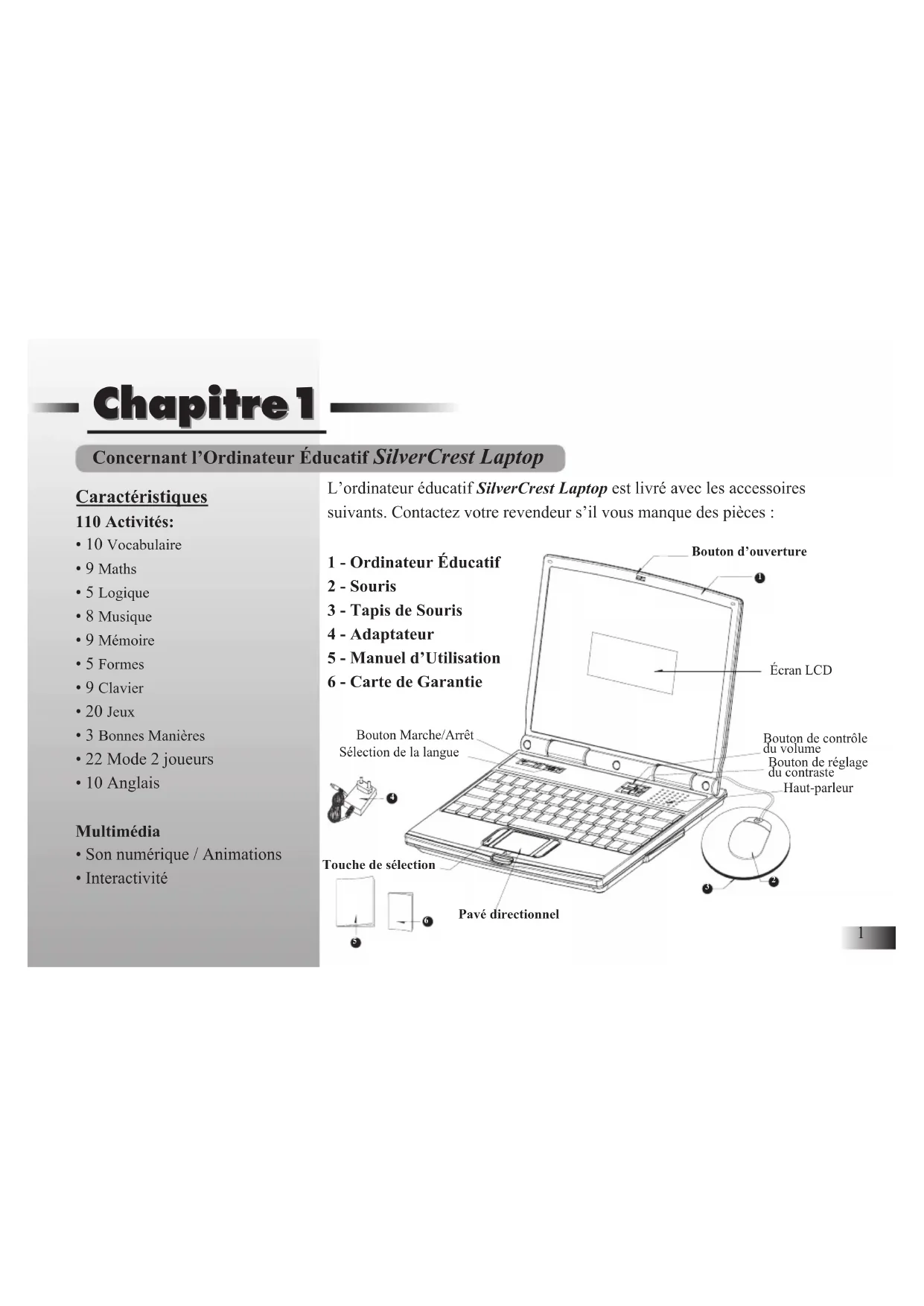 Chapitre1 Chapitre1 Concernant l’Ordinateur Éducatif SilverCrest Laptop Caractéristiques 110 Activités: