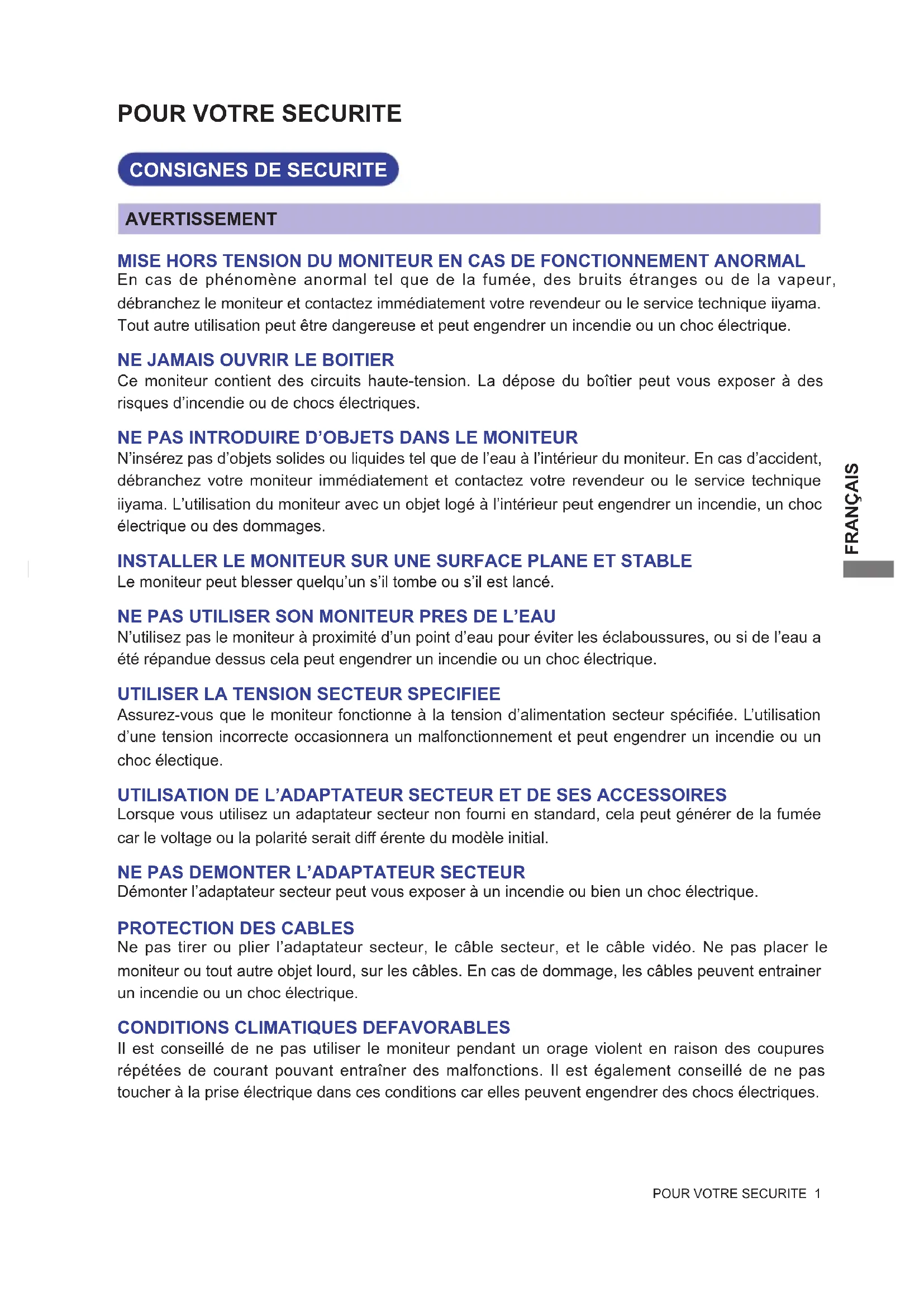 Ce moniteur contient des circuits haute-tension. La dépose du boîtier peut vous exposer à des risques d’incendie ou de chocs électriques. NE PAS INTRODUIRE D’OBJETS DANS LE MONITEUR N’insérez pas d’objets solides ou liquides tel que de l’eau à l’intérieur du moniteur. En cas d’accident, débranchez votre moniteur immédiatement et contactez votre revendeur ou le service technique iiyama. L’utilisation du moniteur avec un objet logé à l’intérieur peut engendrer un incendie, un choc électrique ou des dommages. INSTALLER LE MONITEUR SUR UNE SURFACE PLANE ET STABLE Le moniteur peut blesser quelqu’un s’il tombe ou s’il est lancé. NE PAS UTILISER SON MONITEUR PRES DE L’EAU N’utilisez pas le moniteur à proximité d’un point d’eau pour éviter les éclaboussures, ou si de l’eau a été répandue dessus cela peut engendrer un incendie ou un choc électrique.