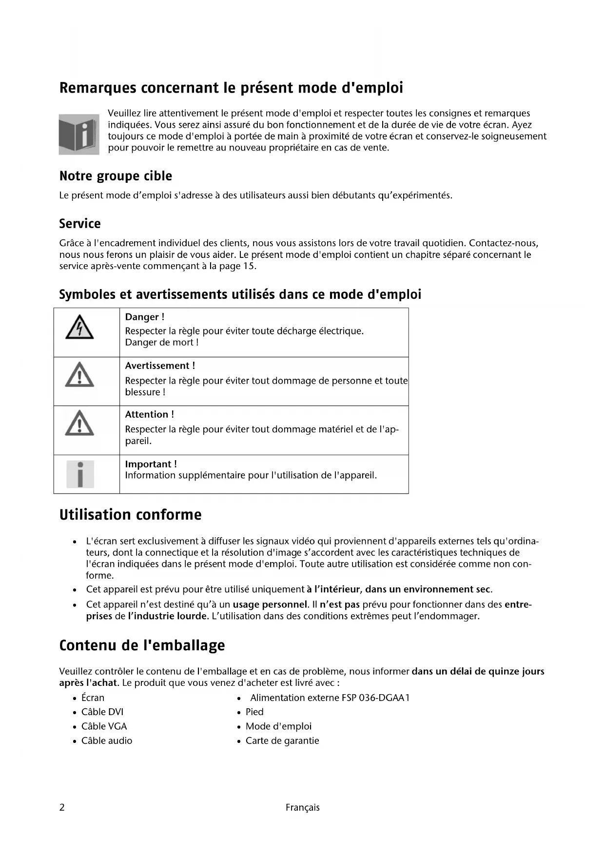 Remarques concernant le présent mode d'emploi Veuillez lire attentivement le présent mode d'emploi et respecter toutes les consignes et remarques indiquées. Vous serez ainsi assuré du bon fonctionnement et de la durée de vie de votre écran. Ayez toujours ce mode d'emploi à portée de main à proximité de votre écran et conservez-le soigneusement pour pouvoir le remettre au nouveau propriétaire en cas de vente. Notre groupe cible Le présent mode d’emploi s'adresse à des utilisateurs aussi bien débutants qu’expérimentés. Service Grâce à l'encadrement individuel des clients, nous vous assistons lors de votre travail quotidien. Contactez-nous, nous nous ferons un plaisir de vous aider. Le présent mode d'emploi contient un chapitre séparé concernant le service après-vente commençant à la page 15. Symboles et avertissements utilisés dans ce mode d'emploi Danger ! Respecter la règle pour éviter toute décharge électrique. Danger de mort ! Avertissement ! Respecter la règle pour éviter tout dommage de personne et toute blessure ! Attention ! Respecter la règle pour éviter tout dommage matériel et de l'ap- pareil. Important ! Information supplémentaire pour l'utilisation de l'appareil. Utilisation conforme L'écran sert exclusivement à diffuser les signaux vidéo qui proviennent d'appareils externes tels qu'ordina- teurs, dont la connectique et la résolution d'image s’accordent avec les caractéristiques techniques de l'écran indiquées dans le présent mode d'emploi. Toute autre utilisation est considérée comme non con- forme. Cet appareil est prévu pour être utilisé uniquement à l’intérieur, dans un environnement sec. Cet appareil n’est destiné qu’à un usage personnel. Il n’est pas prévu pour fonctionner dans des entre- prises de l’industrie lourde. L’utilisation dans des conditions extrêmes peut l’endommager. Contenu de l'emballage Veuillez contrôler le contenu de l'emballage et en cas de problème, nous informer dans un délai de quinze jours après l'achat. Le produit que vous venez d'acheter est livré avec : Écran Câble DVI Câble VGA Câble audio Alimentation externe FSP 036-DGA