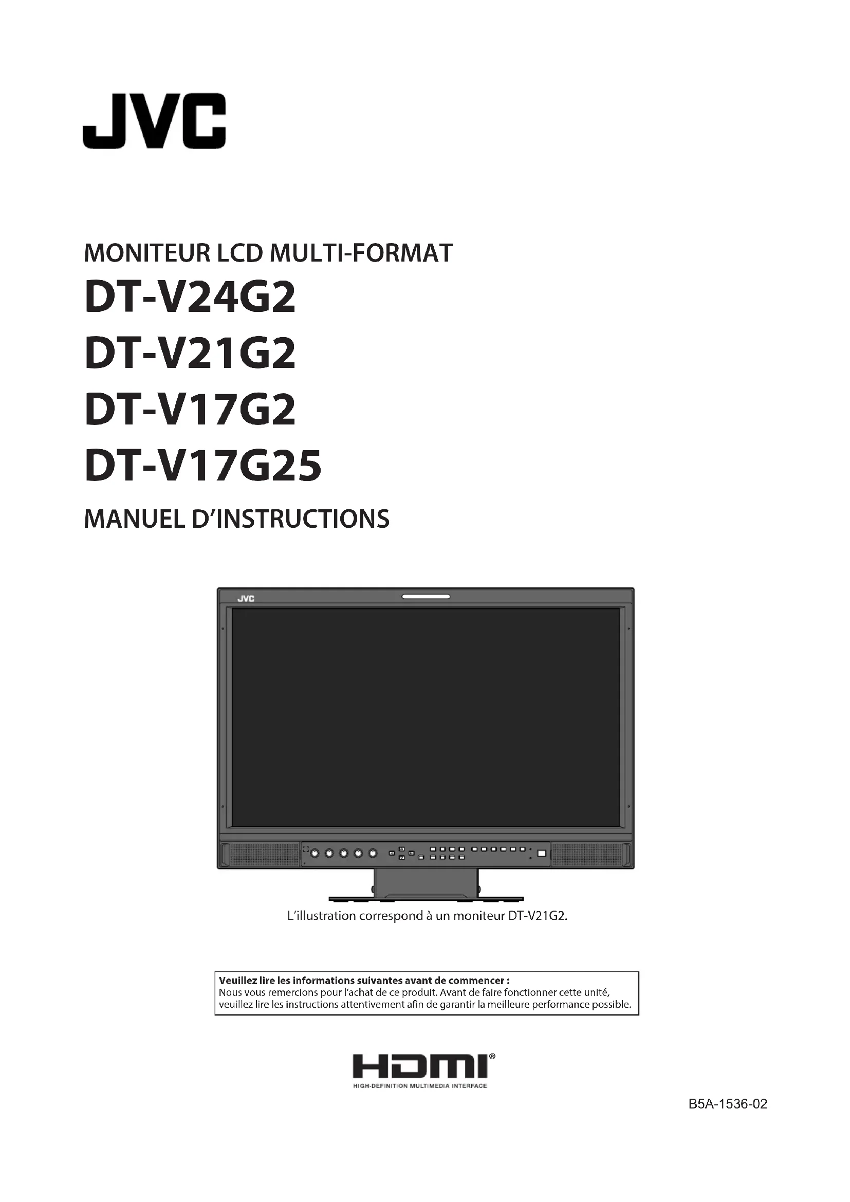 B5A-1536-02 L’illustration correspond à un moniteur DT-V21G2. Veuillez lire les informations suivantes avant de commencer : Nous vous remercions pour l’achat de ce produit. Avant de faire fonctionner cette unité, veuillez lire les instructions attentivement afin de garantir la meilleure performance possible. DT-V24G2_FR.indb 1 2016/07/27 11:13:0222 Précautions de sécurité Assurez-vous de lire attentivement les “Précautions de sécurité”, puis d’utiliser l’appareil correctement. Avertissement: C’est un produit de classe A. Dans un environnement domestique, cet appareil peut causer des interférences radio et dans ce cas l’utilisateur peut être requis de prendre les mesures correctives nécessaires.N’utiliser que la source d’alimentation spécifiée sur l’appareil.