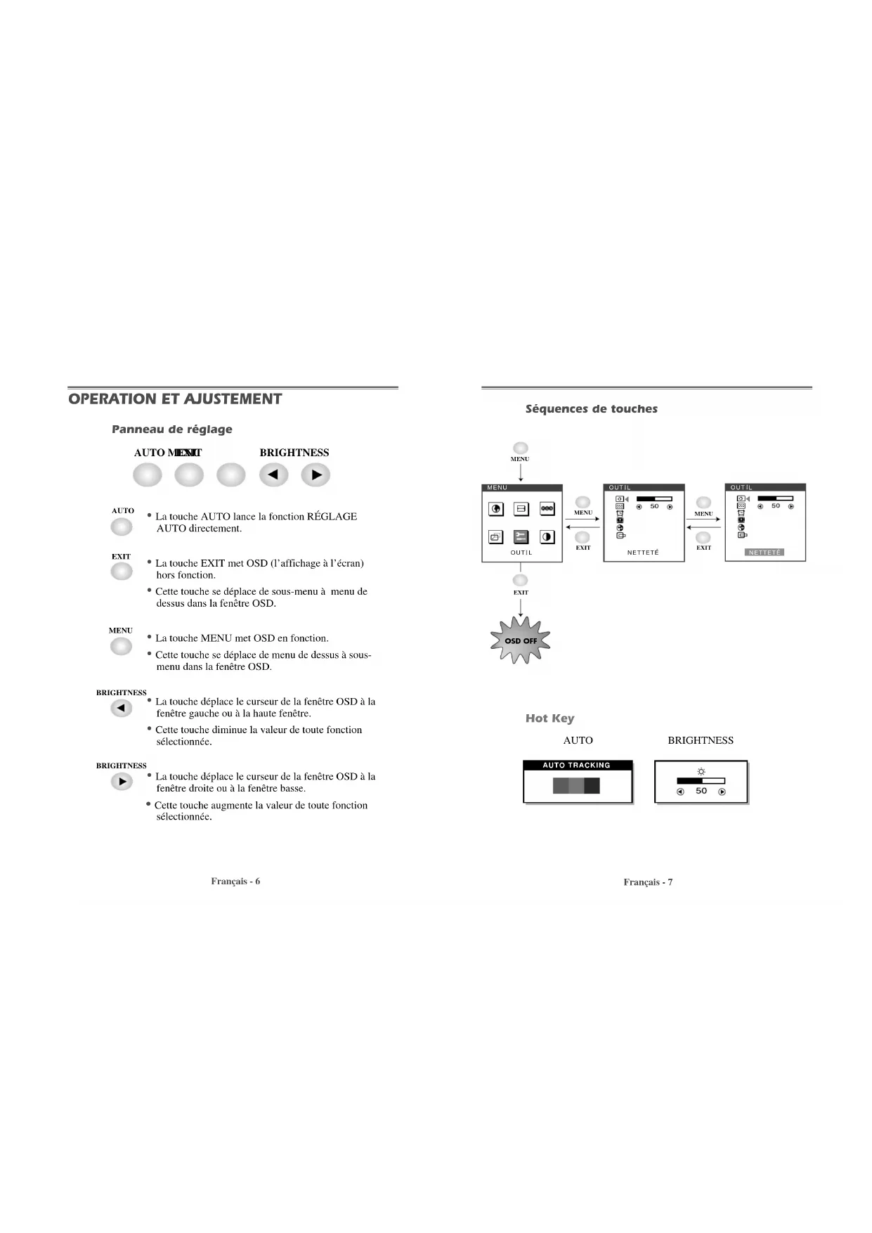 - Cette touche augmente la valeur de toute fonction sélectionnée. AUTO EXIT MENU BRIGHTNESSBRIGHTNESSFrançais - 9 Français - 8 Règle la qualité d’image d’écran. NETTETÉ RÉGLAGE AUTO Règle la qualité et la dimension verticale et horizontale. Sélectionne la langue du menu OSD (6 langages). LANGUE Règle la largeur (dimension horizontale) de l’image d’écran. RÉGLAGE FRÉQUENCE Choisi différentes températures de couleur pré-réglées ou règle vos propres paramètres de couleurs personnalisées. Aiguise le foyer en alignant l’élément d’image illuminé. Réglez jusqu’à l’image d’écran paraît concentré, frisé et acére. Réglage CLOCK FINE après RÉGLAGE FRÉQUENCE fait l’écran clair. Règle la couleur de rouge. Règle la couleur de vert. CLOCK FINE TEMP. DES COULEURS CONTRÔLE DES R. CONTRÔLE DES V. Règle la couleur de bleu. Règle la position de l’affichage horizontalement (gauche ou droite) et verticalement (haut ou bas). Règle la position OSD horizontalement (gauche ou droite) et verticalement (haut ou bas). CONTRÔLE DES B. CENTER H. & CENTER V.