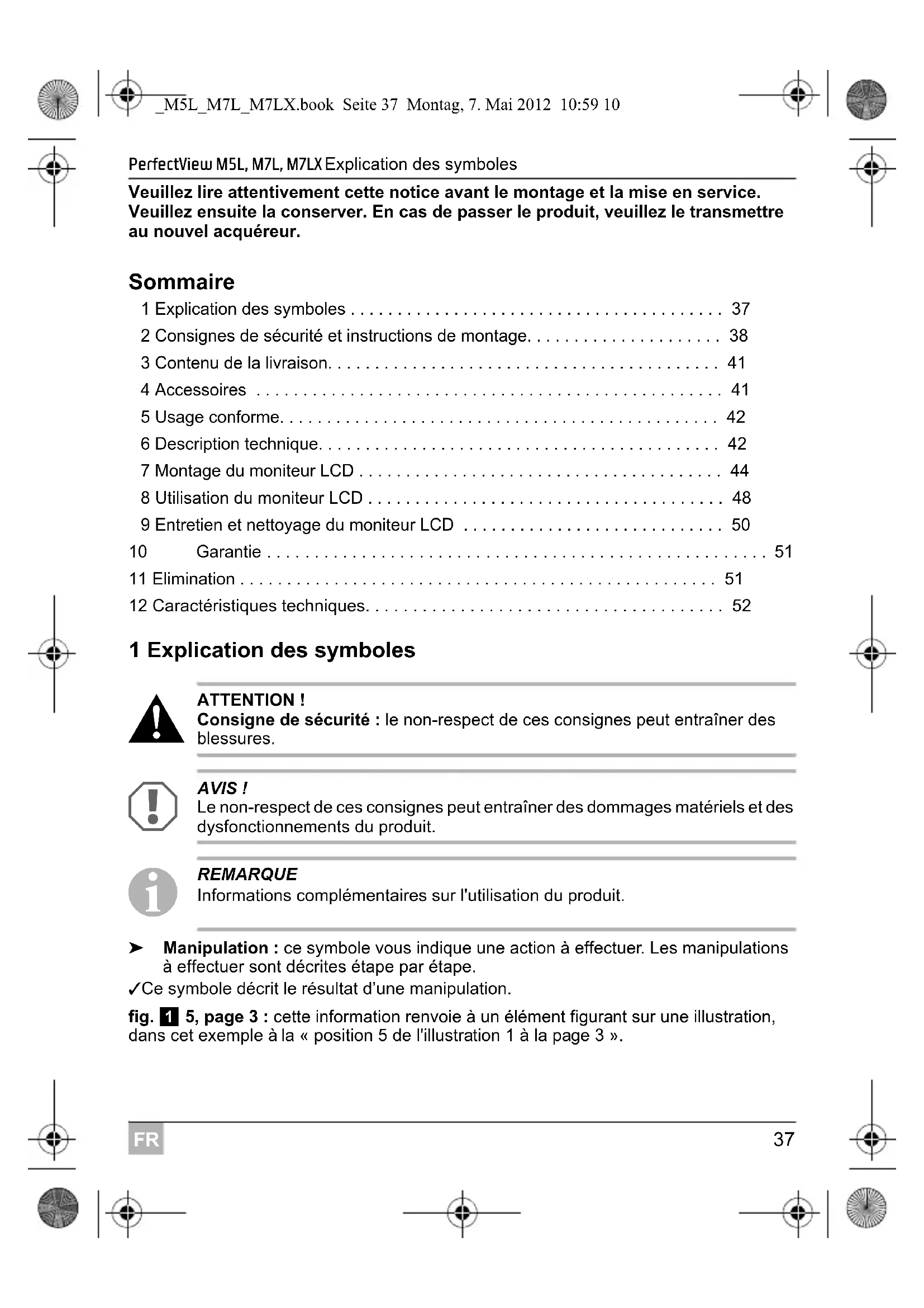 REMARQUE Informations complémentaires sur l'utilisation du produit. ➤ Manipulation : ce symbole vous indique une action à effectuer. Les manipulations à effectuer sont décrites étape par étape. ✓ Ce symbole décrit le résultat d’une manipulation. fig. 1 5, page 3 : cette information renvoie à un élément figurant sur une illustration, dans cet exemple à la « position 5 de l'illustration 1 à la page 3 ». _M5L_M7L_M7LX.book Seite 37 Montag, 7. Mai 2012 10:59 10Consignes de sécurité et instructions de montage PerfectView M5L, M7L, M7LX