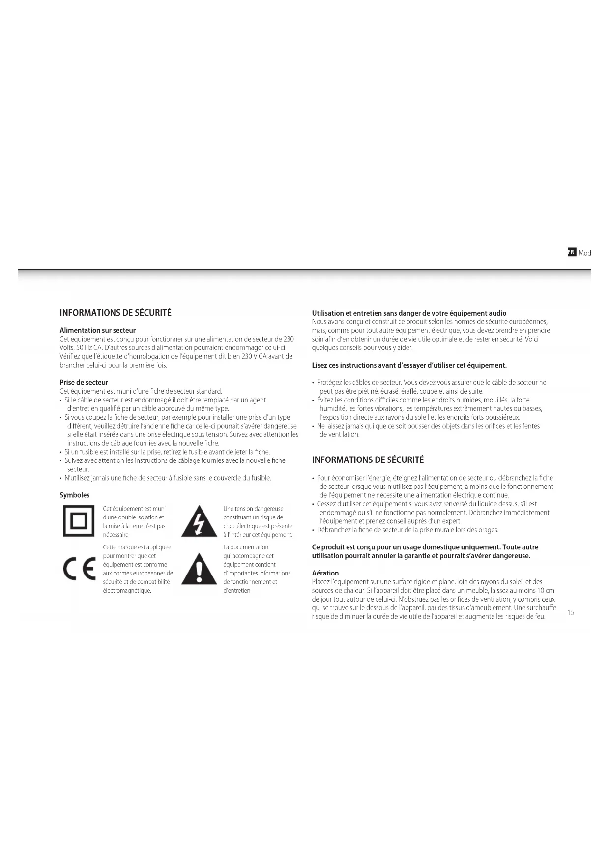 - N’utilisez jamais une fiche de secteur à fusible sans le couvercle du fusible. Symboles Cet équipement est muni d'une double isolation et la mise à la terre n'est pas nécessaire. Une tension dangereuse constituant un risque de choc électrique est présente à l'intérieur cet équipement. Cette marque est appliquée pour montrer que cet équipement est conforme aux normes européennes de sécurité et de compatibilité électromagnétique. La documentation qui accompagne cet équipement contient d'importantes informations de fonctionnement et d'entretien. Utilisation et entretien sans danger de votre équipement audio Nous avons conçu et construit ce produit selon les normes de sécurité européennes, mais, comme pour tout autre équipement électrique, vous devez prendre en prendre soin afin d’en obtenir un durée de vie utile optimale et de rester en sécurité. Voici quelques conseils pour vous y aider. Lisez ces instructions avant d’essayer d’utiliser cet équipement.
