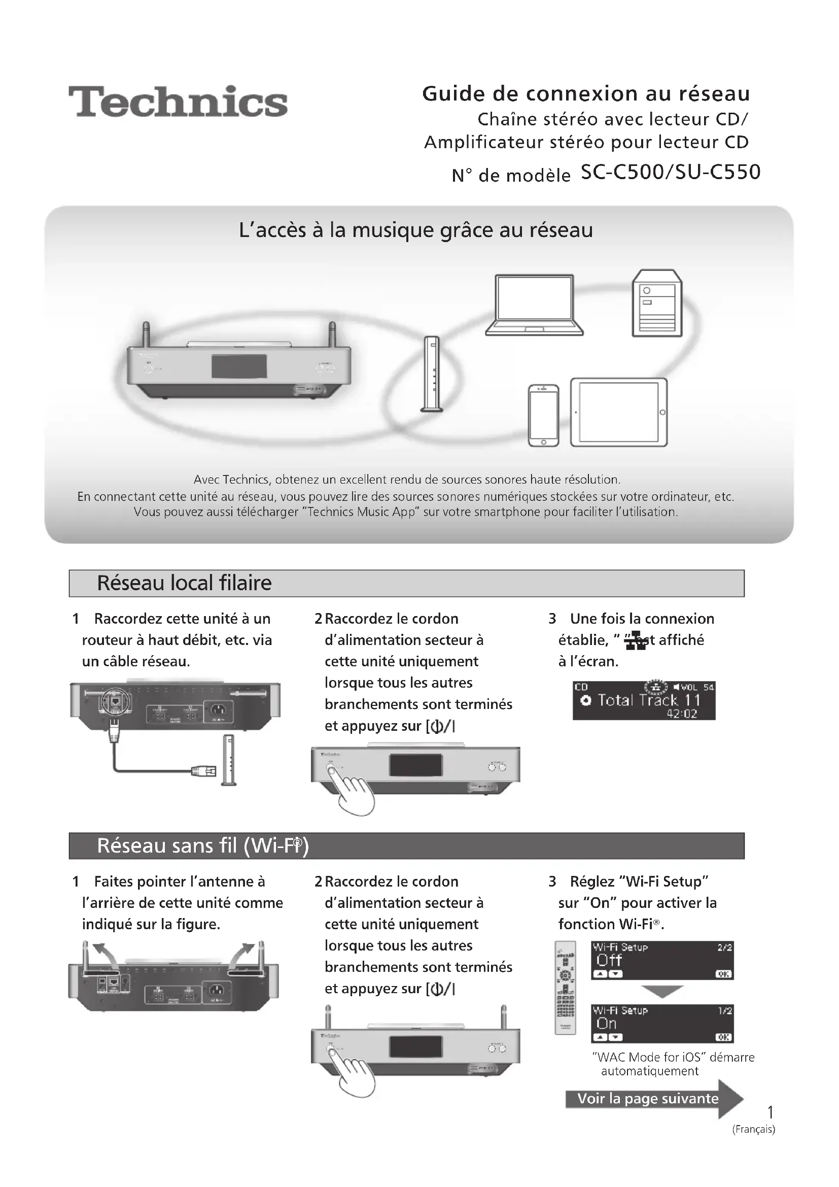 - Alle anderen Warenzeichen sind Warenzeichen der jeweiligen Inhaber.1 Guide de connexion au réseau Chaîne stéréo avec lecteur CD/ Amplificateur stéréo pour lecteur CD N° de modèle SC-C500/SU-C550 L’accès à la musique grâce au réseau Avec Technics, obtenez un excellent rendu de sources sonores haute résolution. En connectant cette unité au réseau, vous pouvez lire des sources sonores numériques stockées sur votre ordinateur, etc. Vous pouvez aussi télécharger “Technics Music App” sur votre smartphone pour faciliter l’utilisation. Réseau local filaire 1 Raccordez cette unité à un routeur à haut débit, etc. via un câble réseau.