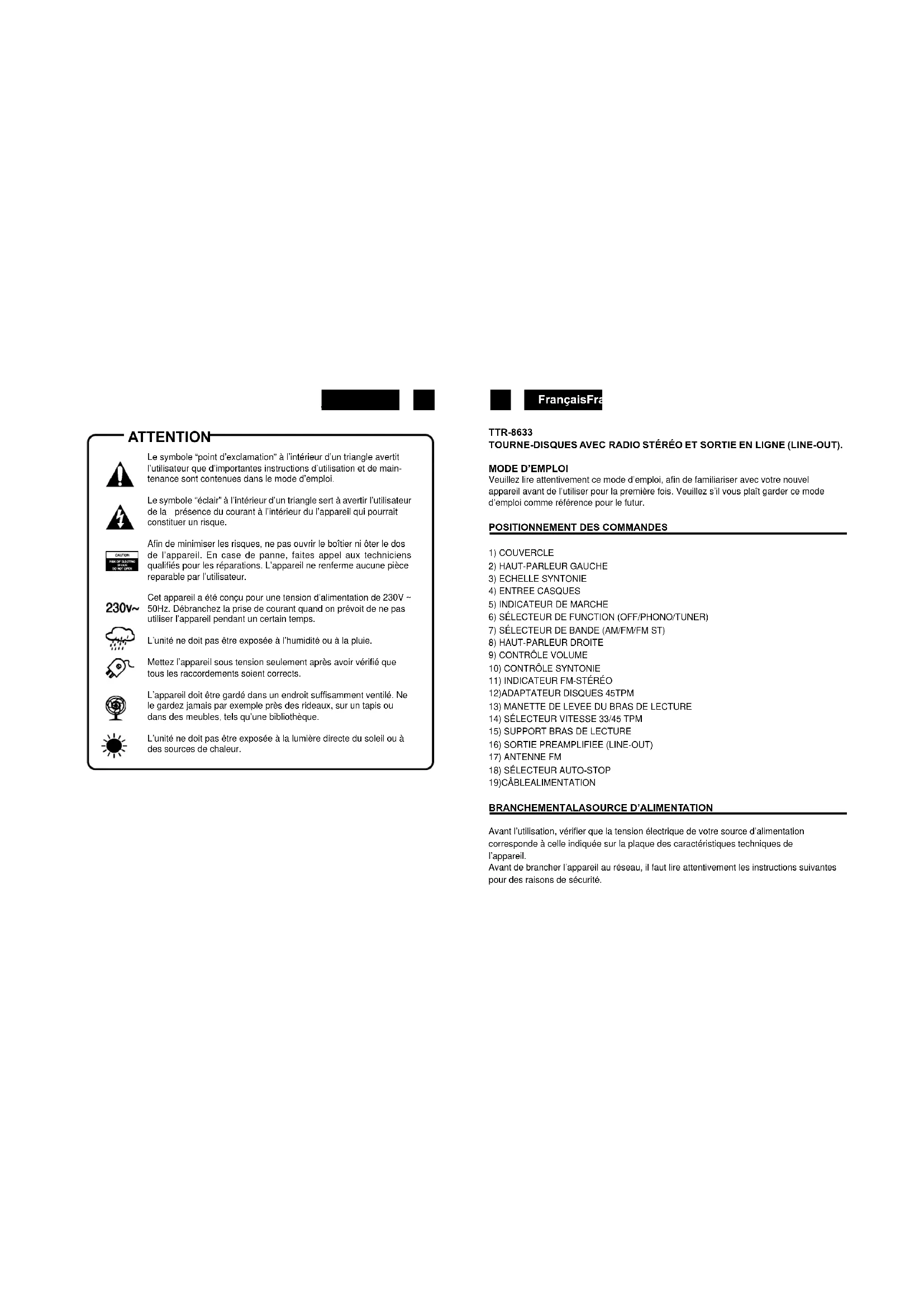 Comment éliminer ce produit - (déchets d'équipements électriques et électroniques) Ce symbole sur le produit ou sa documentation indique qu'il ne doit pas être éliminé en fin de vie avec les autres déchets ménagers. L'élimination incontrôlée des déchets pouvant porter préjudice a l'environnement ou a la santé humaine, veuillez le séparer des autres types de déchets et le recycler de façon responsable. Vous favoriserez ainsi la réutilisation durable des ressources matérielles. Les particuliers sont invites a contacter le distributeur leur ayant vendu le produit ou a se renseigner auprès de leur mairie pour savoir ou et comment ils peuvent se débarrasser de ce produit afin qu'il soit recyclé en respectant l'environnement. Les entreprises sont invitées a contacter leurs fournisseurs et a consulter les conditions de leur contrat de vente. Ce produit ne doit pas être éliminé avec les autres déchets commerciaux. CARACTERISTIQUESTECHNIQUES Alimentation Electrique CA: 230V ~ 50Hz Fréquences Radio FM: 88 - 108 MHz MW: 540 - 1600 kHz Puissance 2 x 1.5 W RMS Caractéristiques sujets à modifications sans avis préalable.ItalianoItaliano 19 20 TTR-8633 GIRADISCHI CON RADIO STEREO E USCITA LINE-OUT. INTRODUZIONE Raccomandiamo la lettura accurata di questo manuale per potervi familiarizzare con il vostro nuovo SISTEMA AUDIO prima di utilizzarlo per la prima volta. Raccomandiamo di conservare questo manuale per futuri riferimenti LOCALIZZAZIONEDEI CONTROLLI