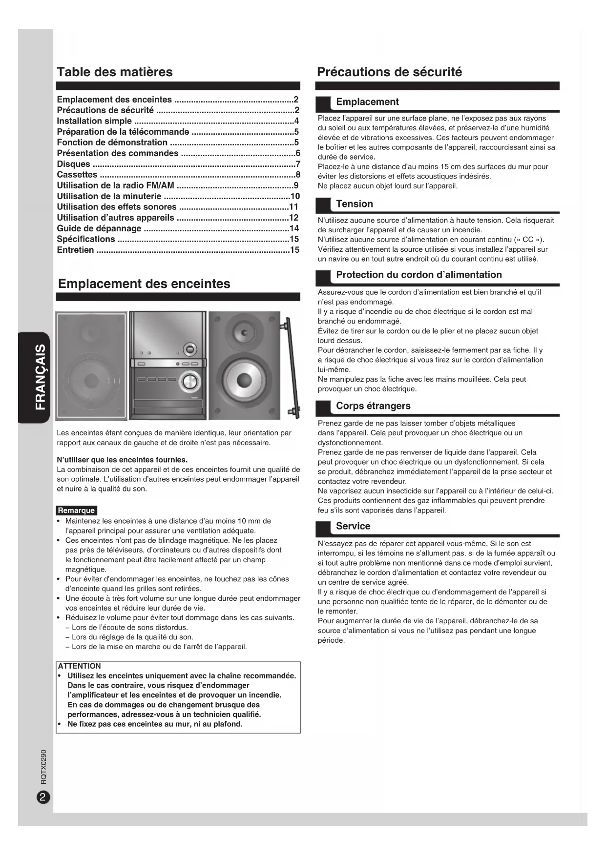 - Entretien Placez l’appareil sur une surface plane, ne l’exposez pas aux rayons du soleil ou aux températures élevées, et préservez-le d’une humidité élevée et de vibrations excessives. Ces facteurs peuvent endommager le boîtier et les autres composants de l’appareil, raccourcissant ainsi sa durée de service. Placez-le à une distance d’au moins 15 cm des surfaces du mur pour éviter les distorsions et effets acoustiques indésirés. Ne placez aucun objet lourd sur l’appareil. N’utilisez aucune source d’alimentation à haute tension. Cela risquerait de surcharger l’appareil et de causer un incendie. N’utilisez aucune source d’alimentation en courant continu (« CC »). Vérifiez attentivement la source utilisée si vous installez l’appareil sur un navire ou en tout autre endroit où du courant continu est utilisé. Assurez-vous que le cordon d’alimentation est bien branché et qu’il n’est pas endommagé. Il y a risque d’incendie ou de choc électrique si le cordon est mal branché ou endommagé. Évitez de tirer sur le cordon ou de le plier et ne placez aucun objet lourd dessus. Pour débrancher le cordon, saisissez-le fermement par sa fiche. Il y a risque de choc électrique si vous tirez sur le cordon d’alimentation lui-même. Ne manipulez pas la fiche avec les mains mouillées. Cela peut provoquer un choc électrique. Prenez garde de ne pas laisser tomber d’objets métalliques dans l’appareil. Cela peut provoquer un choc électrique ou un dysfonctionnement. Prenez garde de ne pas renverser de liquide dans l’appareil. Cela peut provoquer un choc électrique ou un dysfonctionnement. Si cela se produit, débranchez immédiatement l’appareil de la prise secteur et contactez votre revendeur. Ne vaporisez aucun insecticide sur l’appareil ou à l’intérieur de celui-ci. Ces produits contiennent des gaz inflammables qui peuvent prendre feu s’ils sont vaporisés dans l’appareil. N’essayez pas de réparer cet appareil vous-même. Si le son est interrompu, si les témoins ne s’allument pas, si de la fumée apparaît ou si tout autre problème non mentionné dans ce mode d’emploi survient, débranchez le cordon d’alimentation et contactez votre revendeur ou un centre de service agréé. Il y a risque de choc électrique ou d’endommagement de l’appareil si une personne non qualifiée tente de le réparer, de le démonter ou de le remonter. Pour augmenter la durée de vie de l’appareil, débranchez-le de sa source d’alimentation si vous ne l’utilisez pas pendant une longue période. Emplacement Tension Protection du cordon d’alimentation Corps étrangers Service Table des matières Précautions de sécurité Emplacement des enceintes Remarque p. 15