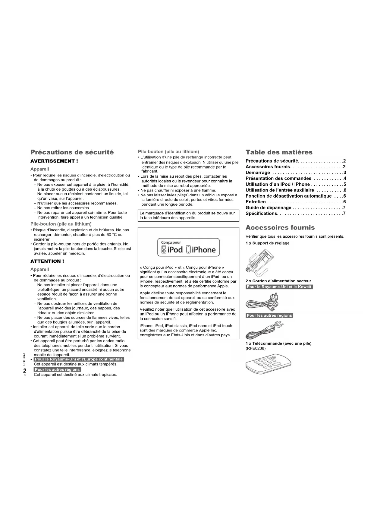 - Ne pas laisser la/les pile(s) dans un véhicule exposé à la lumière directe du soleil, portes et vitres fermées pendant une longue période. Table des matières Précautions de sécurité. . . . . . . . . . . . . . . . . .2 Accessoires fournis. . . . . . . . . . . . . . . . . . . . .2 Démarrage . . . . . . . . . . . . . . . . . . . . . . . . . . . .3 Présentation des commandes . . . . . . . . . . . .4 Utilisation d’un iPod / iPhone . . . . . . . . . . . . .5 Utilisation de l’entrée auxiliaire . . . . . . . . . . .6 Fonction de désactivation automatique . . . .6 Entretien . . . . . . . . . . . . . . . . . . . . . . . . . . . . . .6 Guide de dépannage . . . . . . . . . . . . . . . . . . . .7 Spécifications. . . . . . . . . . . . . . . . . . . . . . . . . .7 Accessoires fournis Vérifier que tous les accessoires fournis sont présents. 1 x Support de réglage 2 x Cordon d’alimentation secteur Pour le Royaume-Uni et le Koweït Pour les autres régions 1 x Télécommande (avec une pile) (RFE0238) Le marquage d’identification du produit se trouve sur la face inférieure des appareils. « Conçu pour iPod » et « Conçu pour iPhone » signifient qu’un accessoire électronique a été conçu pour se connecter spécifiquement à un iPod, ou un iPhone, respectivement, et a été certifié conforme par le concepteur aux normes de performance Apple. Apple décline toute responsabilité concernant le fonctionnement de cet appareil ou sa conformité aux normes de sécurité et de réglementation. Veuillez noter que l’utilisation de cet accessoire avec un iPod ou un iPhone peut affecter la performance de la connexion sans fil. iPhone, iPod, iPod classic, iPod nano et iPod touch sont des marques de commerce Apple Inc. enregistrées aux États-Unis et dans d’autres pays.