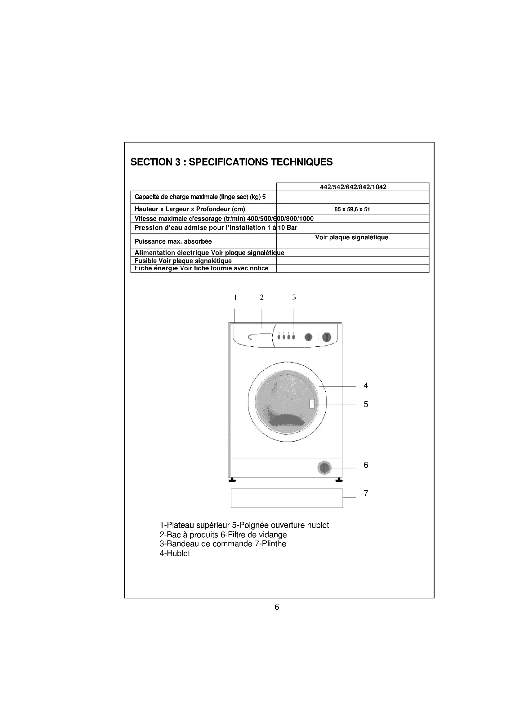 1-Plateau supérieur 5-Poignée ouverture hublot 2-Bac à produits 6-Filtre de vidange 3-Bandeau de commande 7-Plinthe 4-Hublot 6SECTION 4