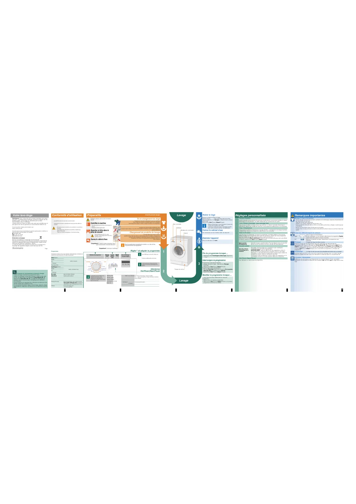 Consignes de sécurité – Veuillez lire et vous conformer à la notice d'installation et d'utilisation ainsi qu'à toutes les autres informations fournies avec votre lave-linge.– Conservez ces documents pour toute utilisation ultérieure. Risque d'électrocution – Débranchez toujours la machine en tenant la fiche, ne tirez jamais directement sur le cordon d'alimentation.– Ne branchez / débranchez jamais la machine avec les mains humides.Danger de mort Lorsque la machine ne sert plus :– Débranchez la fiche de la prise de courant.– Sectionnez le cordon d'alimentation pour le rendre inutilisable.– Détruisez le système de fermeture du hublot. Les enfants ne risqueront pas de s'enfermer et de mettre leur vie en danger. Risque d'asphyxie – Tenez les emballages, les plastiques et divers éléments des emballages hors de la portée des enfants. Risque d'empoisonnement – Rangez la lessive et les additifs hors de portée des enfants. Risque d'explosion – Les articles textile préalablement traités avec des produits nettoyants à base de solvants, du type détachants, benzine, peuvent provoquer une explosion une fois chargés dans le tambour. Rincer abondamment à la main les articles avant de les charger. Risque de blessures – Le hublot peut devenir très chaud. – Faites attention lorsque vous vidangez le bain lessiviel chaud. – Ne montez jamais sur le lave-linge. – Ne vous appuyez jamais sur le hublot ouvert. – Ne saisissez pas le tambour s'il tourne encore. – Faites attention lorsque vous ouvrez le bac à produits en cours de fonctionnement. Valeurs de consommation selon le modèle Programme Charge Puissance*** Eau*** Durée du programme
