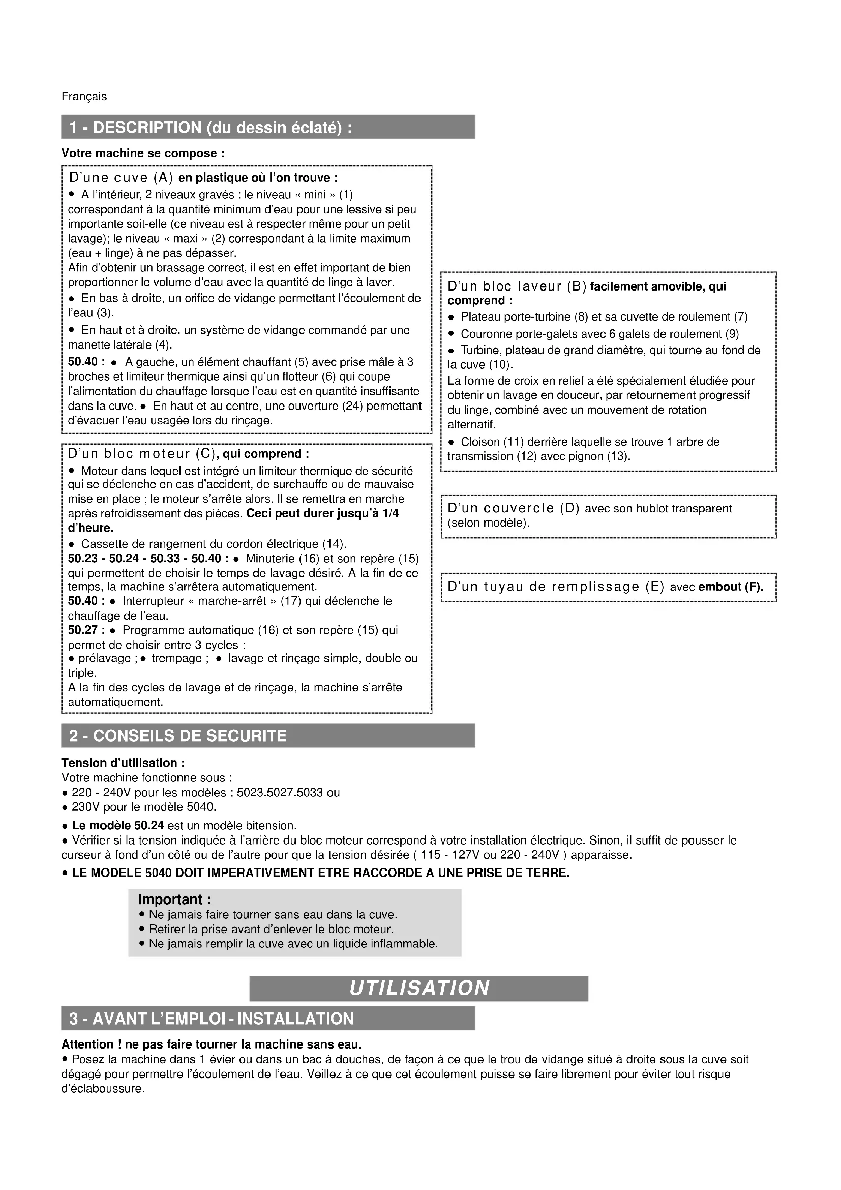 Modèle 50.23 - 50.24 - 50.33 - 50.40 Vous pouvez réaliser plusieurs lavages successifs dans le même bain. Il vous suffit d’ajouter de l’eau pour faire varier la température selon la nature des tissus à laver. Eventuellement, vous pouvez rajouter un peu de produit de lavage.9 - RINÇAGE