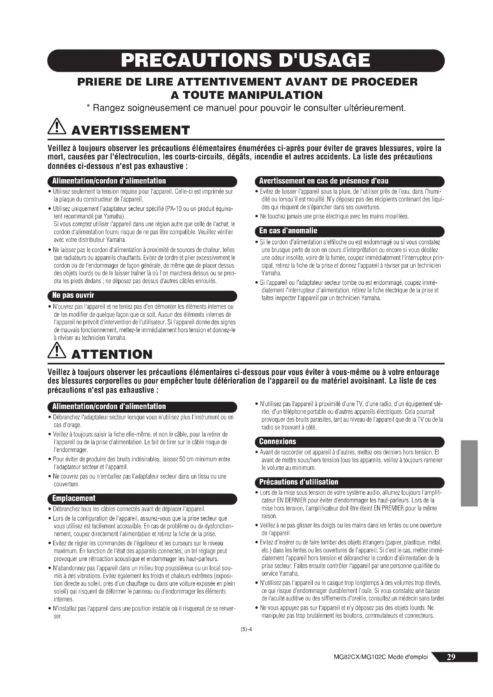 - Rangez soigneusement ce manuel pour pouvoir le consulter ultérieurement. AVERTISSEMENT Veillez à toujours observer les précautions élémentaires énumérées ci-après pour éviter de graves blessures, voire la mort, causées par l'électrocution, les courts-circuits, dégâts, incendie et autres accidents. La liste des précautions données ci-dessous n'est pas exhaustive :• Utilisez seulement la tension requise pour l'appareil. Celle-ci est imprimée sur la plaque du constructeur de l'appareil.• Utilisez uniquement l'adaptateur secteur spécifié (PA-10 ou un produit équiva-lent recommandé par Yamaha). Si vous comptez utiliser l'appareil dans une région autre que celle de l'achat, le cordon d'alimentation fourni risque de ne pas être compatible. Veuillez vérifier avec votre distributeur Yamaha.• Ne laissez pas le cordon d'alimentation à proximité de sources de chaleur, telles que radiateurs ou appareils chauffants. Evitez de tordre et plier excessivement le cordon ou de l'endommager de façon générale, de même que de placer dessus des objets lourds ou de le laisser traîner là où l'on marchera dessus ou se pren-dra les pieds dedans ; ne déposez pas dessus d'autres câbles enroulés.• N'ouvrez pas l'appareil et ne tentez pas d'en démonter les éléments internes ou de les modifier de quelque façon que ce soit. Aucun des éléments internes de l'appareil ne prévoit d'intervention de l'utilisateur. Si l'appareil donne des signes de mauvais fonctionnement, mettez-le immédiatement hors tension et donnez-le à réviser au technicien Yamaha.• Evitez de laisser l'appareil sous la pluie, de l'utiliser près de l'eau, dans l'humi-dité ou lorsqu'il est mouillé. N'y déposez pas des récipients contenant des liqui-des qui risquent de s'épancher dans ses ouvertures.• Ne touchez jamais une prise électrique avec les mains mouillées.• Si le cordon d'alimentation s'effiloche ou est endommagé ou si vous constatez une brusque perte de son en cours d'interprétation ou encore si vous décèlez une odeur insolite, voire de la fumée, coupez immédiatement l'interrupteur prin-cipal, retirez la fiche de la prise et donnez l'appareil à réviser par un technicien Yamaha.• Si l'appareil ou l'adaptateur secteur tombe ou est endommagé, coupez immé-diatement l'interrupteur d'alimentation, retirez la fiche électrique de la prise et faites inspecter l'appareil par un technicien Yamaha. ATTENTION Veillez à toujours observer les précautions élémentaires ci-dessous pour vous éviter à vous-même ou à votre entourage des blessures corporelles ou pour empêcher toute détérioration de l'appareil ou du matériel avoisinant. La liste de ces précautions n'est pas exhaustive :• Débranchez l'adaptateur secteur lorsque vous n'utilisez plus l'instrument ou en cas d'orage.• Veillez à toujours saisir la fiche elle-même, et non le câble, pour la retirer de l'appareil ou de la prise d'alimentation. Le fait de tirer sur le câble risque de l'endommager.• Pour éviter de produire des bruits indésirables, laissez 50 cm minimum entre l'adaptateur secteur et l'appareil. • Ne couvrez pas ou n'emballez pas l'adaptateur secteur dans un tissu ou une couverture.• Débranchez tous les câbles connectés avant de déplacer l'appareil.• Lors de la configuration de l'appareil, assurez-vous que la prise secteur que vous utilisez est facilement accessible. En cas de problème ou de dysfonction-nement, coupez directement l'alimentation et retirez la fiche de la prise.• Evitez de régler les commandes de l'égaliseur et les curseurs sur le niveau maximum. En fonction de l'état des appareils connectés, un tel réglage peut provoquer une rétroaction acoustique et endommager les haut-parleurs.• N'abandonnez pas l'appareil dans un milieu trop poussiéreux ou un local sou-mis à des vibrations. Evitez également les froids et chaleurs extrêmes (exposi-tion directe au soleil, près d'un chauffage ou dans une voiture exposée en plein soleil) qui risquent de déformer le panneau ou d'endommager les éléments internes.• N'installez pas l'appareil dans une position instable où il risquerait de se renver- ser.