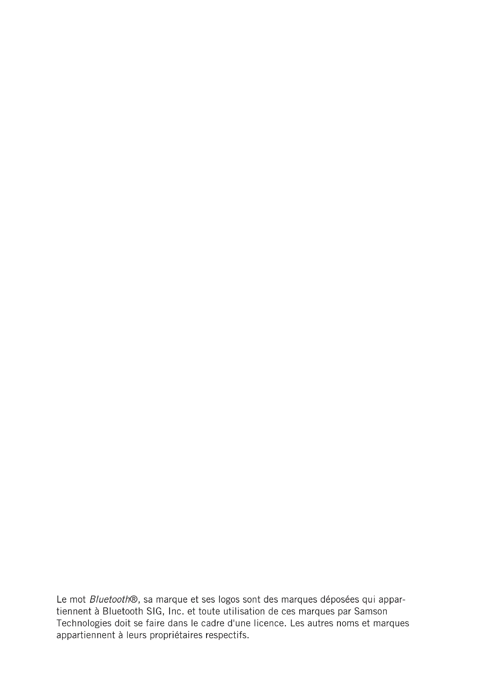 Le mot Bluetooth®, sa marque et ses logos sont des marques déposées qui appariennent à Bluetooth SIG, Inc. et toute utilisation de ces marques par Samson Technologies doit se faire dans le cadre d'une licence. Les autres noms et marques apparitennent à leurs propriétaires respectifs.