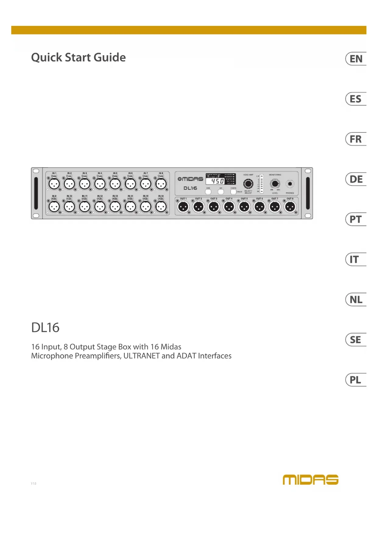 Téléchargez la notice de votre Table de mixage au format PDF gratuitement ! Retrouvez votre notice DL16 - Midas et reprennez votre appareil électronique en main. Sur cette page sont publiés tous les documents nécessaires à l'utilisation de votre appareil DL16 de la marque Midas.