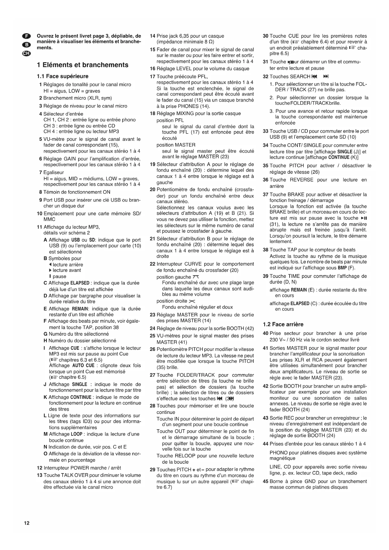 14 Prise jack 6,35 pour un casque (impédance minimale 8 Ω) 15 Fader de canal pour mixer le signal de canal sur le master ou pour les faire entrer et sortir, respectivement pour les canaux stéreo 1 à 4 16 Réglement LEVEL pour le volume du casque 17 Touche préécoute PFL, respectivement pour les canaux stéreo 1 à 4 Si la touche est enclenchée, le signal de canal correspondant peut être écouté avant le fader du canal (15) via un casque branché à la prise PHONES (14). 18 Réglement MIXING pour la sortie casque position PFL seul le signal du canal d'entrée dont la touche PFL (17) est enforcée peut être écouté position MASTER seul le signal master peut être écouté avant le réglage MASTER (23) 19 Sélecteur d'attribution A pour le réglage de fondu enchaîné (20): déterminé lequel des canaux 1 à 4 entre lorsque le réglage est à gauche 20 Potentiomètre de fondu enchaîné (crossfader) pour un fondu enchaîné entre deux canaux stéreo. Sélectionnez les canaux voulus avec les sélecteurs d'attribution A (19) et B (21). Si vous ne devez pas utiliser la fonction, mettez les sélecteurs sur le même numéro de canal et poussez le crossfader à gauche. 21 Sélecteur d'attribution B pour le réglage de fondu enchaîné (20): détermine lequel des canaux 1 à 4 entre lorsque le réglage est à droite 22 Interrupteur CURVE pour le comportement de fondu enchaîné du crossfader (20) position gauche Fondu enchaîné dur avec une plage large dans laquelle les deux canaux sont audibles au même volume position droite Fondu enchaîné régulier et doux 23 Réglement MASTER pour le niveau de sortie des prises MASTER (14) 24 Réglement de niveau pour la sortie BOOTH (42) 25 VU-mètres pour le signal master des prises MASTER (41) 26 Potentiomètre PITCH pour modifier la vitesse de lecture du lecteur MP3. La vitesse ne peut être modifiée que lorsque la touche PITCH (35) brille. 27 Touche FOLDER/TRACK pour commuter entre sélection de titres (la touche ne brille pas) et sélection de dossiers (la touche brille); la sélection de titres ou de dossiers s'effectue avec les touches (39) 28 Touches pour mémoriser et dire une boucle continue Touche IN pour déterminer le point de départ d'un segment pour une boucle continue Touche OUT pour déterminer le point de fin et le démarrage simultané de la boucle; pour quitter la boucle, appuyez une nouvelle fois sur la touche Touche RELOOP pour une nouvelle lecture de la boucle 29 Touches PITCH + et - pour adapter le rythme du titre en cours au rythme d'un morceau de musique lu sur un autre appareil (chapitre 6.7)