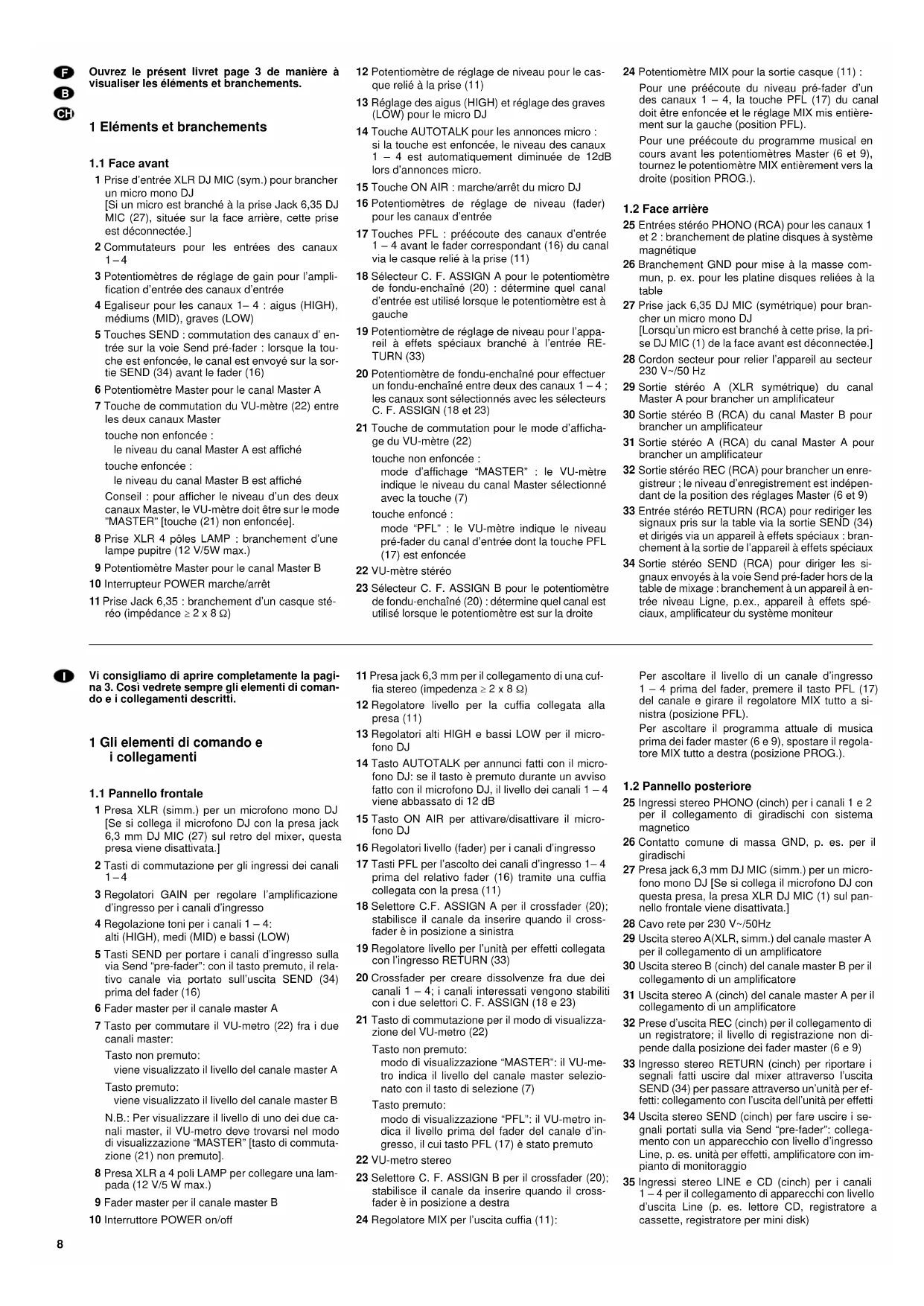 1 Prise d’entrée XLR DJ MIC (sym.) pour brancher un micro mono DJ [Si un micro est branché à la prise Jack 6,35 DJ MIC (27), située sur la face arrière, cette prise est déconnectée.] 2 Commutateurs pour les entrées des canaux 1–4 3 Potentiomètres de réglage de gain pour l’ampli- fication d’entrée des canaux d’entrée 4 Egaliseur pour les canaux 1– 4 : aigus (HIGH), médiums (MID), graves (LOW) 5 Touches SEND : commutation des canaux d’ en- trée sur la voie Send pré-fader : lorsque la tou- che est enfoncée, le canal est envoyé sur la sor- tie SEND (34) avant le fader (16) 6 Potentiomètre Master pour le canal Master A 7 Touche de commutation du VU-mètre (22) entre les deux canaux Master touche non enfoncée : le niveau du canal Master A est affiché touche enfoncée : le niveau du canal Master B est affiché Conseil : pour afficher le niveau d’un des deux canaux Master, le VU-mètre doit être sur le mode ”MASTER” [touche (21) non enfoncée]. 8 Prise XLR 4 pôles LAMP : branchement d’une lampe pupitre (12 V/5W max.) 9 Potentiomètre Master pour le canal Master B 10 Interrupteur POWER marche/arrêt 11 Prise Jack 6,35 : branchement d’un casque sté- réo (impédance ≥ 2 x 8 Ω) 12 Potentiomètre de réglage de niveau pour le cas- que relié à la prise (11) 13 Réglage des aigus (HIGH) et réglage des graves (LOW) pour le micro DJ 14 Touche AUTOTALK pour les annonces micro : si la touche est enfoncée, le niveau des canaux 1 – 4 est automatiquement diminuée de 12dB lors d’annonces micro. 15 Touche ON AIR : marche/arrêt du micro DJ 16 Potentiomètres de réglage de niveau (fader) pour les canaux d’entrée 17 Touches PFL : préécoute des canaux d’entrée 1 – 4 avant le fader correspondant (16) du canal via le casque relié à la prise (11) 18 Sélecteur C. F. ASSIGN A pour le potentiomètre de fondu-enchaîné (20) : détermine quel canal d’entrée est utilisé lorsque le potentiomètre est à gauche 19 Potentiomètre de réglage de niveau pour l’appa- reil à effets spéciaux branché à l’entrée RE- TURN (33) 20 Potentiomètre de fondu-enchaîné pour effectuer un fondu-enchaîné entre deux des canaux 1 – 4 ; les canaux sont sélectionnés avec les sélecteurs C. F. ASSIGN (18 et 23) 21 Touche de commutation pour le mode d’afficha- ge du VU-mètre (22) touche non enfoncée : mode d’affichage “MASTER” : le VU-mètre indique le niveau du canal Master sélectionné avec la touche (7) touche enfoncé : mode “PFL” : le VU-mètre indique le niveau pré-fader du canal d’entrée dont la touche PFL (17) est enfoncée 22 VU-mètre stéréo 23 Sélecteur C. F. ASSIGN B pour le potentiomètre de fondu-enchaîné (20) : détermine quel canal est utilisé lorsque le potentiomètre est sur la droite 24 Potentiomètre MIX pour la sortie casque (11) : Pour une préécoute du niveau pré-fader d’un des canaux 1 – 4, la touche PFL (17) du canal doit être enfoncée et le réglage MIX mis entière- ment sur la gauche (position PFL). Pour une préécoute du programme musical en cours avant les potentiomètres Master (6 et 9), tournez le potentiomètre MIX entièrement vers la droite (position PROG.).