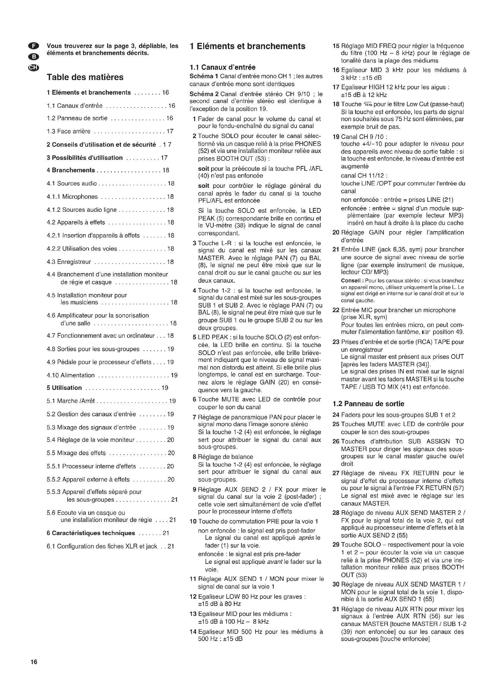 Schéma 1 Canal dʼentrée mono CH 1 ; les autres canaux dʼentrée mono sont identiques Schéma 2 Canal dʼentrée stéréo CH 9 /10 ; le second canal dʼentrée stéréo est identique à lʼexception de la position 19. 1 Fader de canal pour le volume du canal et pour le fondu-enchaîné du signal du canal 2 Touche SOLO pour écouter le canal sélec- tionné via un casque relié à la prise PHONES (52) et via une installation moniteur reliée aux prises BOOTH OUT (53) : soit pour la préécoute si la touche PFL /AFL (40) nʼest pas enfoncée soit pour contrôler le réglage général du canal après le fader du canal si la touche PFL/AFL est enfoncée Si la touche SOLO est enfoncée, la LED PEAK (5) correspondante brille en continu et le VU-mètre (38) indique le signal de canal correspondant. 3 Touche L-R : si la touche est enfoncée, le signal du canal est mixé sur les canaux MASTER. Avec le réglage PAN (7) ou BAL (8), le signal ne peut être mixé que sur le canal droit ou sur le canal gauche ou sur les deux canaux. 4 Touche 1-2 : si la touche est enfoncée, le signal du canal est mixé sur les sous-groupes SUB 1 et SUB 2. Avec le réglage PAN (7) ou BAL (8), le signal ne peut être mixé que sur le groupe SUB 1 ou le groupe SUB 2 ou sur les deux groupes. 5 LED PEAK : si la touche SOLO (2) est enfon- cée, la LED brille en continu. Si la touche SOLO nʼest pas enfoncée, elle brille briève- ment indiquant que le niveau de signal maxi- mal non distordu est atteint. Si elle brille plus longtemps, le canal est en surcharge. Tour- nez alors le réglage GAIN (20) en consé- quence vers la gauche. 6 Touche MUTE avec LED de contrôle pour couper le son du canal 7 Réglage de panoramique PAN pour placer le signal mono dans lʼimage sonore stéréo Si la touche 1-2 (4) est enfoncée, le réglage sert pour attribuer le signal du canal aux sous-groupes. 8 Réglage de balance Si la touche 1-2 (4) est enfoncée, le réglage sert pour attribuer le signal du canal aux sous-groupes. 9 Réglage AUX SEND 2 / FX pour mixer le signal du canal sur la voie 2 (post-fader) ; cette voie sert simultanément de voie dʼeffet pour le processeur interne dʼeffets 10 Touche de commutation PRE pour la voie 1 non enfoncée : le signal est pris post-fader Le signal du canal est appliqué après le fader (1) sur la voie. enfoncée : le signal est pris pre-fader Le signal est appliqué avant le fader sur la voie. 11 Réglage AUX SEND 1 / MON pour mixer le signal de canal sur la voie 1 12 Egaliseur LOW 80 Hz pour les graves : ±15 dB à 80 Hz 13 Egaliseur MID pour les médiums : ±15 dB à 100 Hz – 8 kHz 14 Egaliseur MID 500 Hz pour les médiums à 500 Hz : ±15 dB 15 Réglage MID FREQ pour régler la fréquence du filtre (100 Hz – 8 kHz) pour le réglage de tonalité dans la plage des médiums 16 Egaliseur MID 3 kHz pour les médiums à 3 kHz : ±15 dB 17 Egaliseur HIGH 12 kHz pour les aigus : ±15 dB à 12 kHz 18 Touche pour le filtre Low Cut (passe-haut) Si la touche est enfoncée, les parts de signal non souhaités sous 75 Hz sont éliminées, par exemple bruit de pas. 19 Canal CH 9 /10 : touche +4/