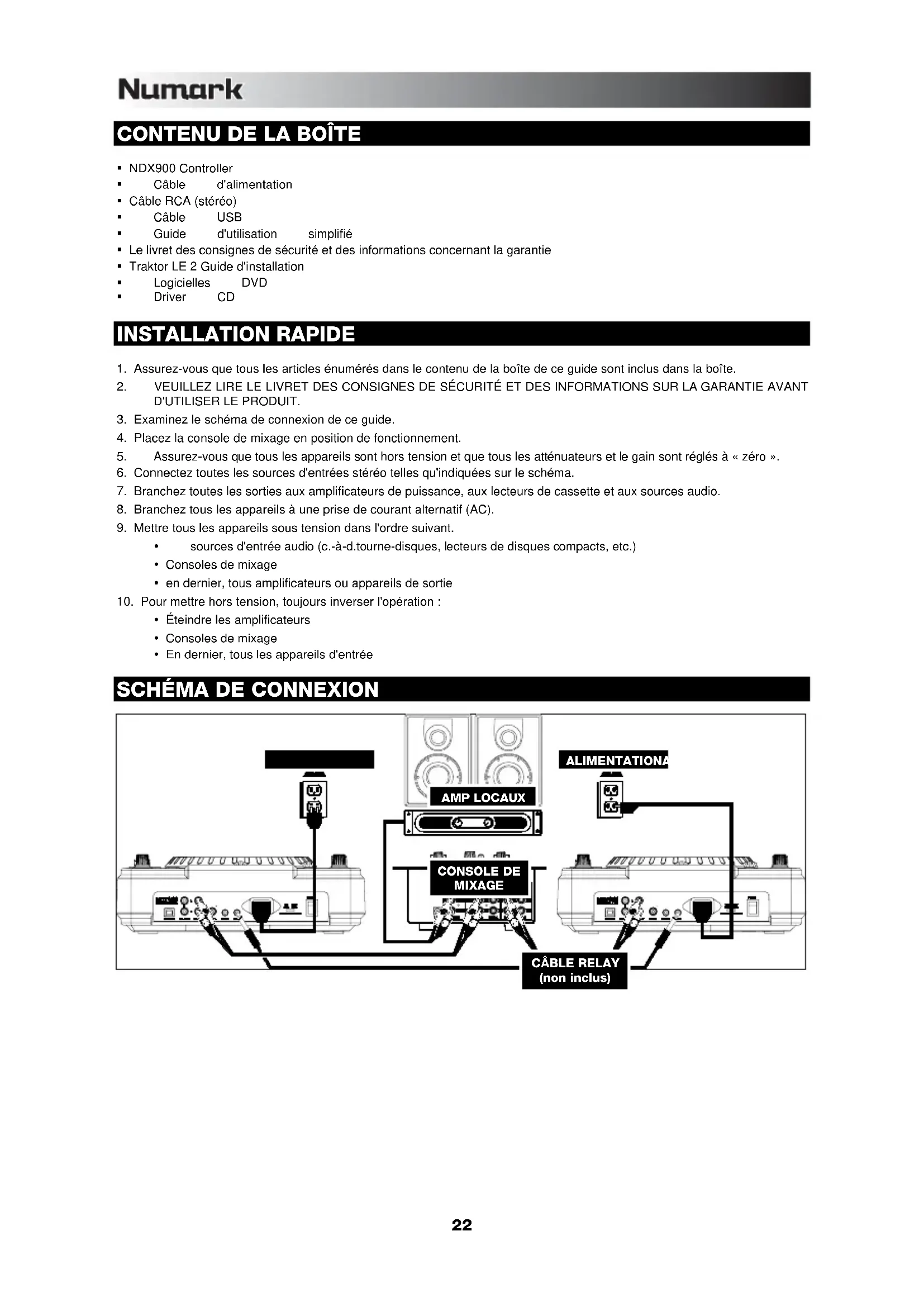 NDX900 Controller Câble d'alimentation Câble RCA (stéréo) Câble USB Guide d'utilisation simplifié Le livret des consignes de sécurité et des informations concernant la garantie Traktor LE 2 Guide d'installation Logicielles DVD Driver CD INSTALLATION RAPIDE