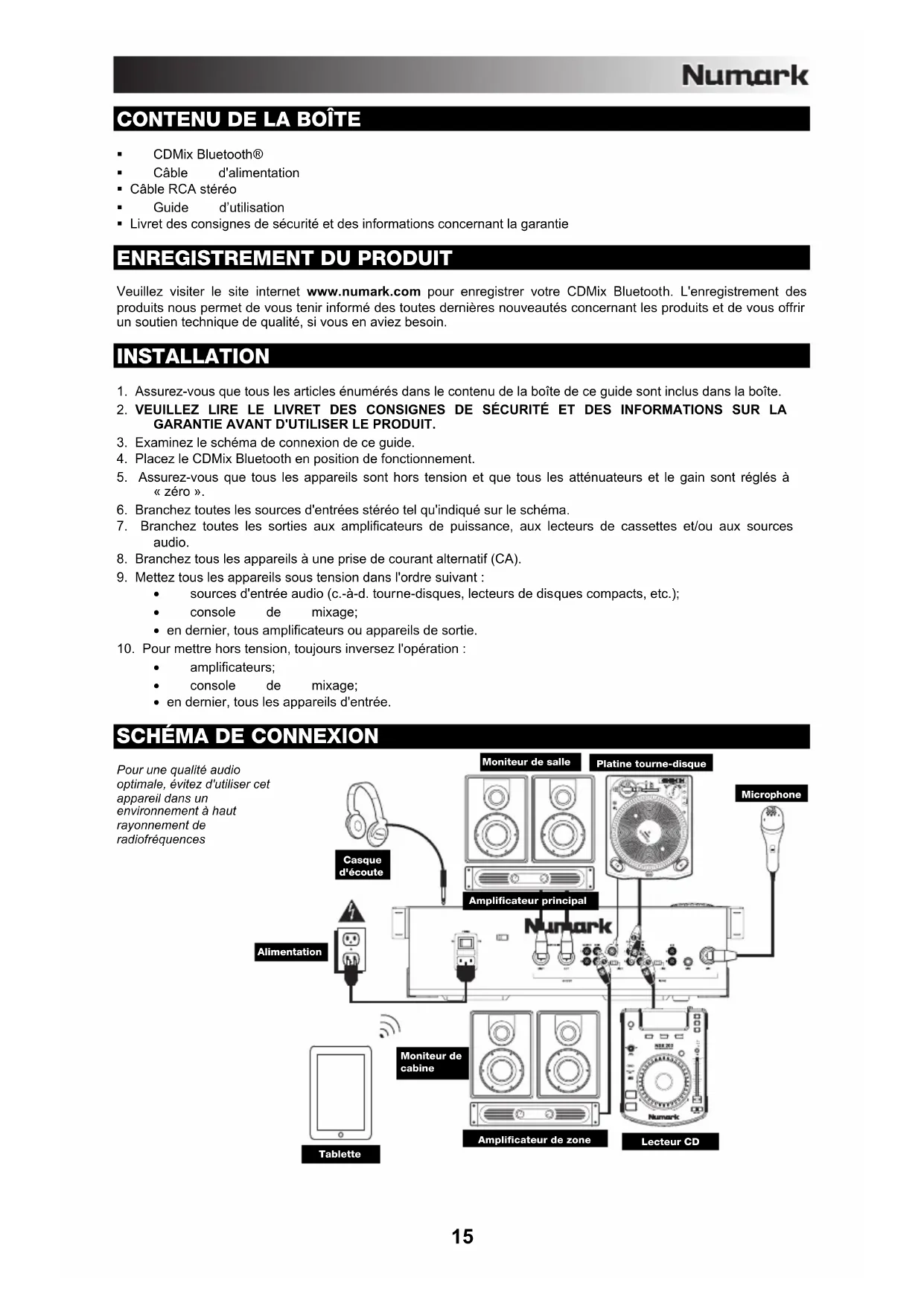 Veuillez visiter le site internet www.numark.com pour enregistrer votre CDMix Bluetooth. L'enregistrement des produits nous permet de vous tenir informé des toutes dernières nouveautés concernant les produits et de vous offrir un soutien technique de qualité, si vous en aviez besoin. INSTALLATION