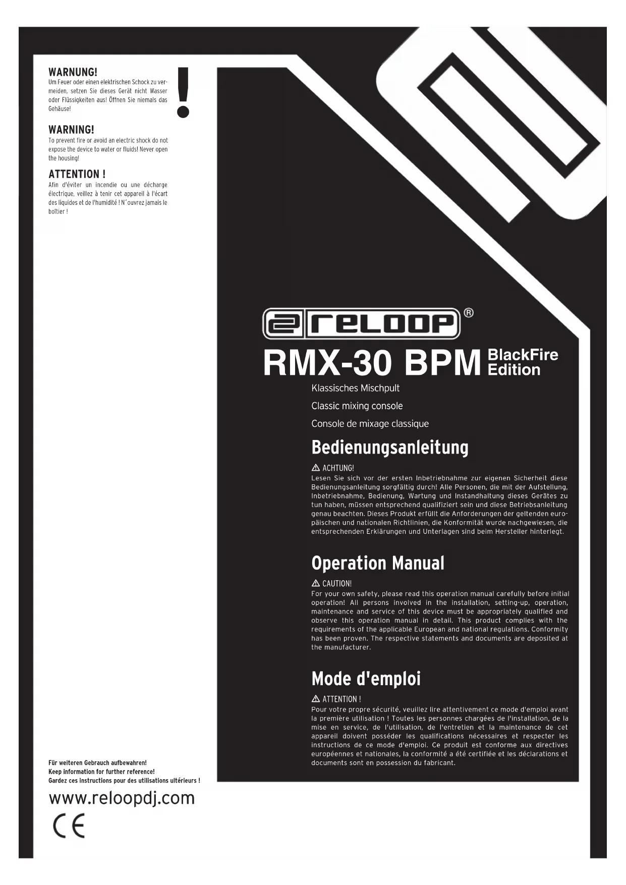 Nous vous félicitons d'avoir choisi la console de mixage Reloop RMX-30 BPM, preuve de la confiance que vous accordez à notre technologie pour Disc Jockey. Avant la mise en service, nous vous prions de lire attentivement ce mode d'emploi et de respecter les instructions pendant l'utilisation.