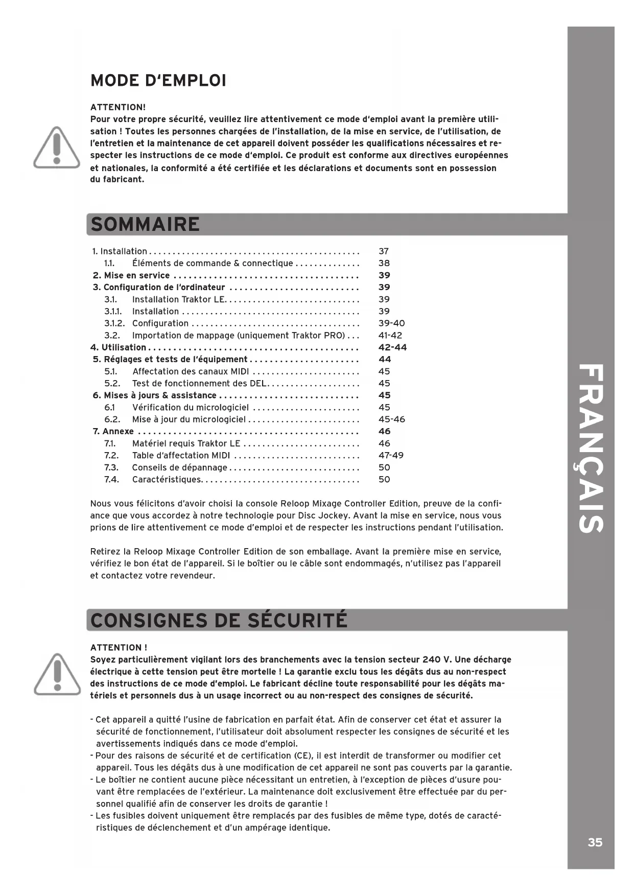 Nous vous félicitons d'avoir choisi la console Reloop Mixage Controller Edition, preuve de la confiance que vous accordez à notre technologie pour Disc Jockey. Avant la mise en service, nous vous prions de lire attentivement ce mode d'emploi et de respecter les instructions pendant l'utilisation.