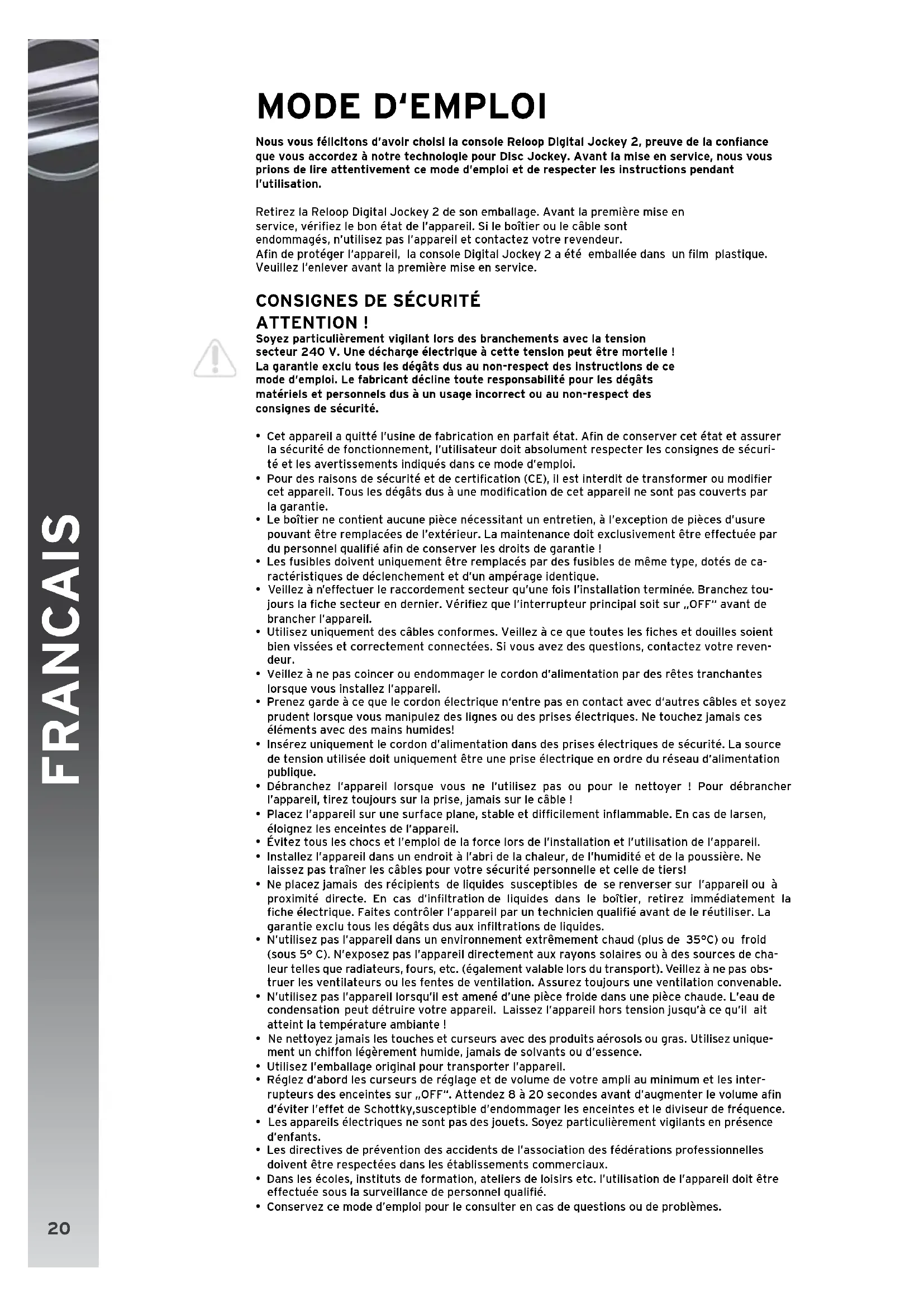 Nous vous félicitons d'avoir choisi la console Reloop Digital Jockey 2, preuve de la confiance que vous accordez à notre technologie pour Disc Jockey. Avant la mise en service, nous vous prions de lire attentivement ce mode d'emploi et de respecter les instructions pendant l'utilisation.
