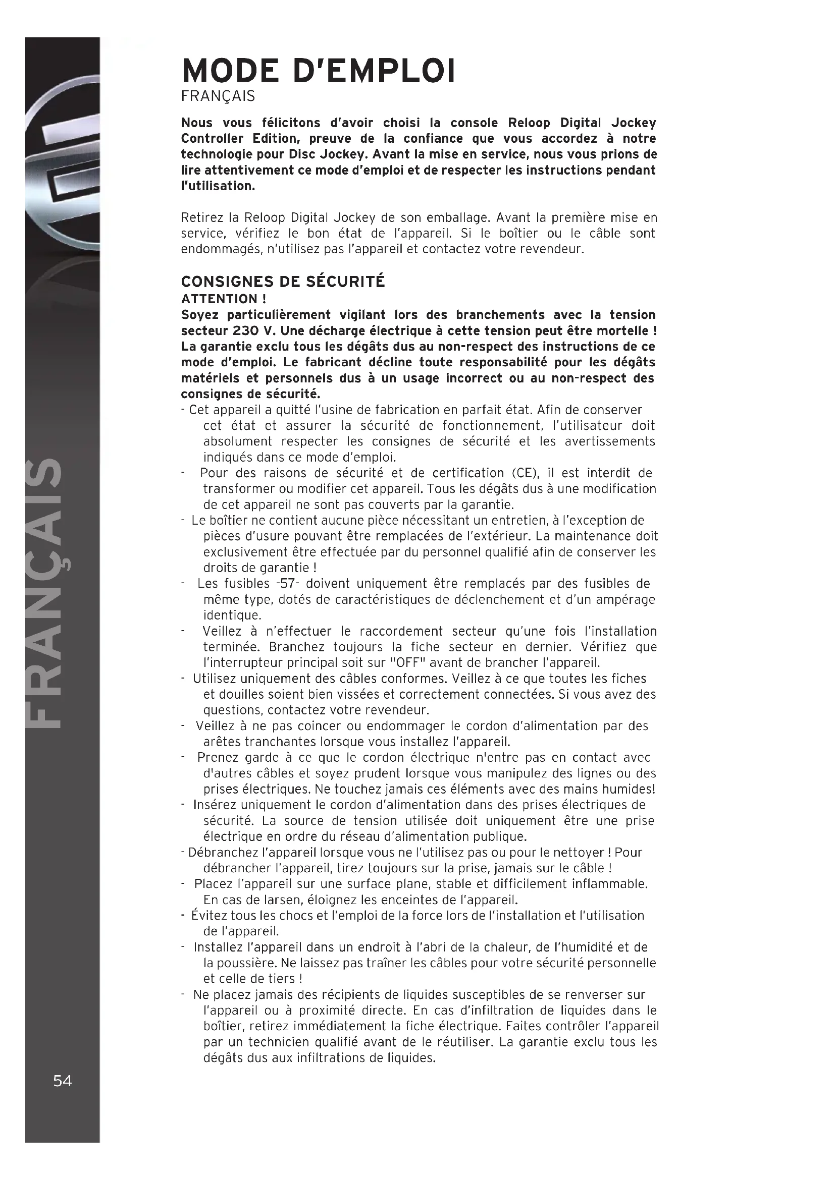 Nous vous félicitons d'avoir besoin la console Reloop Digital Jockey Controller Edition, preuve de la confiance que vous accordez à notre technologie pour Disc Jockey. Avant la mise en service, nous vous prions de dire attentivement ce mode d'emploi et de respecter les instructions pendant l'utilisation.