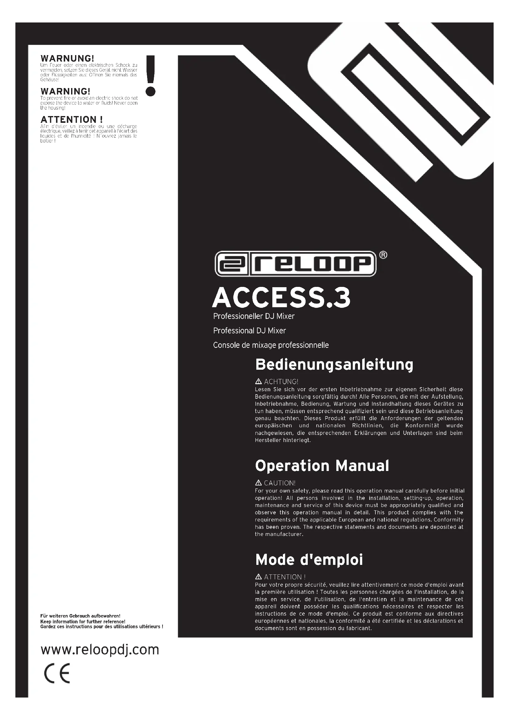 Nous vous félicitons d'avoir choisi la console de mixage Reloop Access.3, preuve de la confiance que vous accordez à notre technologie pour Disc Jockey. Avant la mise en service, nous vous prions de lire attentivement ce mode d'emploi et de respecter les instructions pendant l'utilisation.