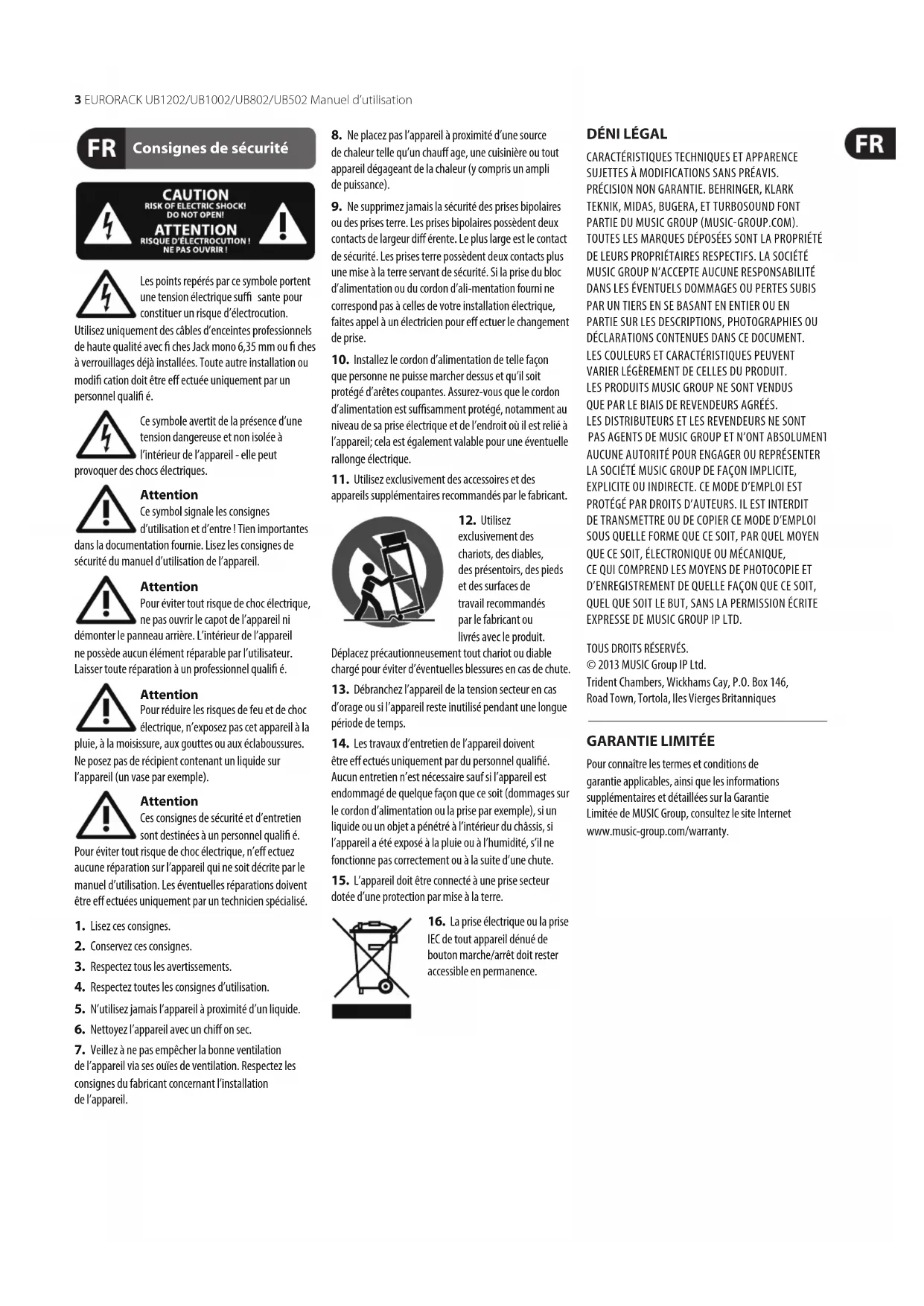 4. Caractéristiques Techniques .................................. 103 EURORACK UB1202/UB1002/UB802/UB502 Manuel d’utilisation Consignes de sécurité