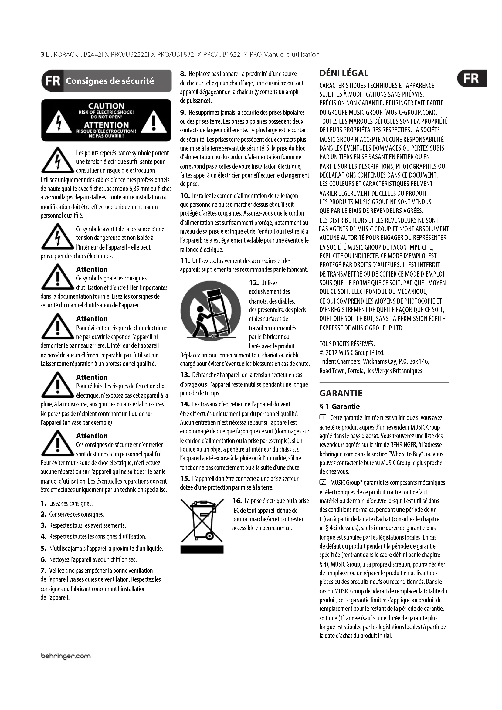 PAS AGENTS DE MUSICGROUP ET N’ONT ABSOLUMENT AUCUNE AUTORITÉ POUR ENGAGER OU REPRÉSENTER LA SOCIÉTÉ MUSICGROUP DE FAÇON IMPLICITE, EXPLICITE OU INDIRECTE. CE MODE D’EMPLOI EST PROTÉGÉ PAR DROITS D’AUTEURS. IL EST INTERDIT DE TRANSMETTRE OU DE COPIER CE MODE D’EMPLOI SOUS QUELLE FORME QUE CE SOIT, PAR QUEL MOYEN QUE CE SOIT, ÉLECTRONIQUE OU MÉCANIQUE, CEQUI COMPREND LES MOYENS DE PHOTOCOPIE ET D’ENREGISTREMENT DE QUELLE FAÇON QUE CE SOIT, QUEL QUE SOIT LE BUT, SANS LA PERMISSION ÉCRITE EXPRESSE DE MUSICGROUPIPLTD. TOUS DROITS RÉSERVÉS. © 2012 MUSICGroupIPLtd. Trident Chambers, Wickhams Cay, P.O. Box 146, Road Town, Tortola, Iles Vierges Britanniques § 1 Garantie (1) Cette garantie limitée n’est valide que si vous avez acheté ce produit auprès d’un revendeur MUSICGroup agréé dans le pays d’achat. Vous trouverez une liste des revendeurs agréés sur le site de BEHRINGER, à l’adresse behringer. com dans la section “Where to Buy”, ou vous pouvez contacter le bureau MUSICGroup le plus proche de chez vous. (2) MUSICGroup* garantit les composants mécaniques et électroniques de ce produit contre tout défaut matériel ou de main-d’oeuvre lorsqu’il est utilisé dans des conditions normales, pendant une période de un (1) an à partir de la date d’achat (consultez le chapitre n°§4 ci-dessous), saufsi une durée de garantie plus longue est stipulée par les législations locales. En cas de défaut du produit pendant la période de garantie spéci ée (rentrant dans le cadre dé ni par le chapitre §4), MUSICGroup, à sa propre discrétion, pourra décider de remplacer ou de réparer le produit en utilisant des pièces ou des produits neufs ou reconditionnés. Dansle cas où MUSICGroup déciderait de remplacer la totalité du produit, cettegarantie limitée s’applique au produit de remplacement pour le restant de la période de garantie, soitune (1) année (sauf si une durée de garantie plus longue est stipulée par les législations locales) à partir de la date d’achat du produit initial. Consignes de sécurité