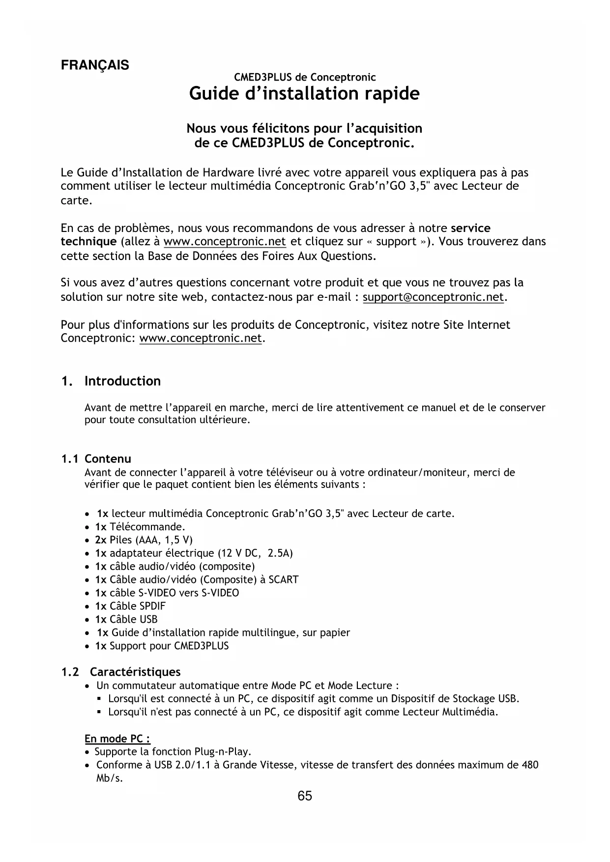 Nos you felicitons pour l'acquisition de ce CMED3PLUS de Conceptronic.