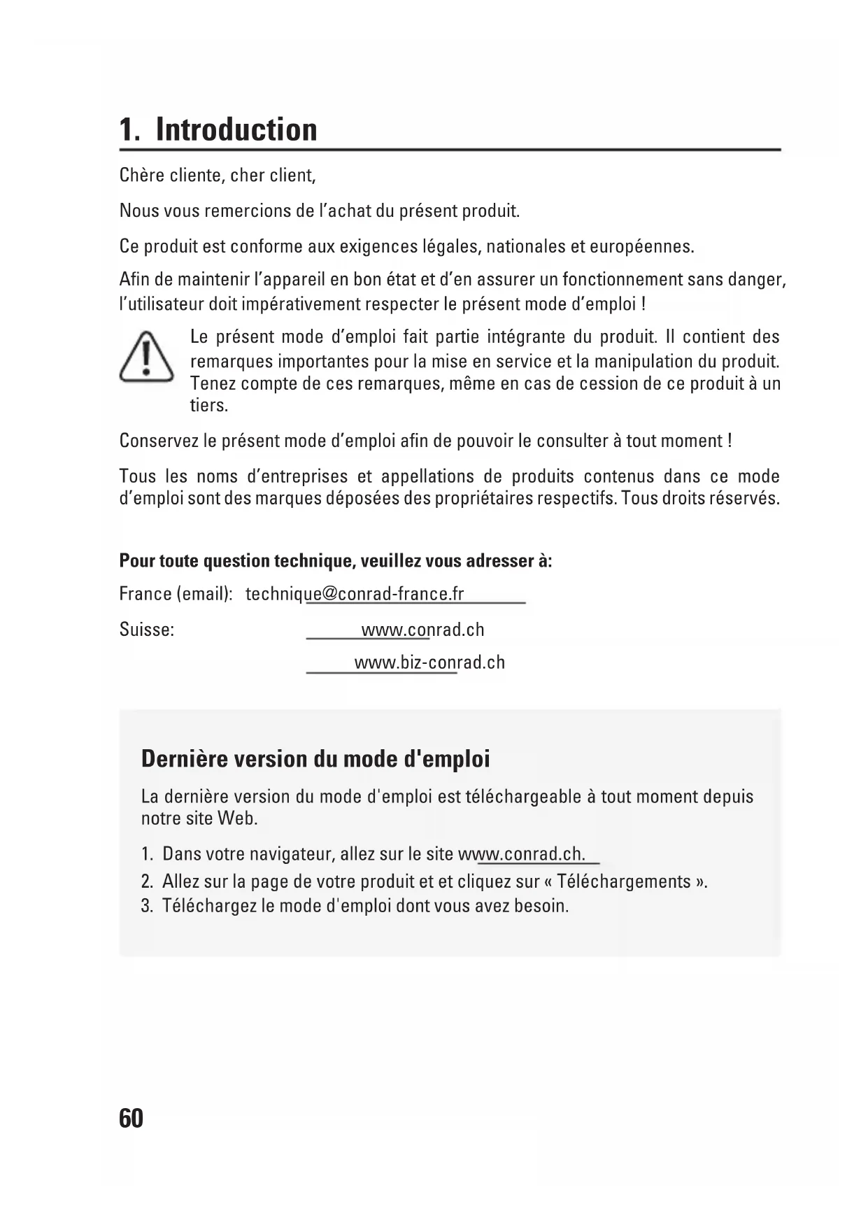 Le present mode d'emploi fait partie intégrante du produit. Il contient des remarques importantes pour la mise en service et la manipulation du produit. Tenez compte de ces remarques, même en cas de cession de ce produit à un tiers.