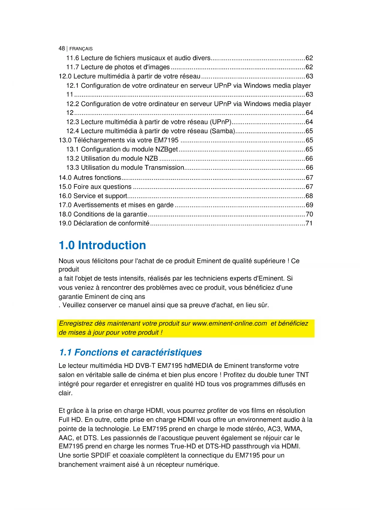 Nous vous félicitons pour l'achat de ce produit Eminent de qualité supérieure ! Ce produit a fait l'objet de tests intensifs, réalisés par les techniciens experts d'Eminent. Si vous veniez à rencontrer des problèmes avec ce produit, vous bénéficiez d'une garantie Eminent de cinq ans . Veuillez conserver ce manuel ainsi que sa preuve d'achat, en lieu sûr. Enregistrez dès maintenant votre produit sur www.eminent-online.com et bénéficiez de mises à jour pour votre produit !