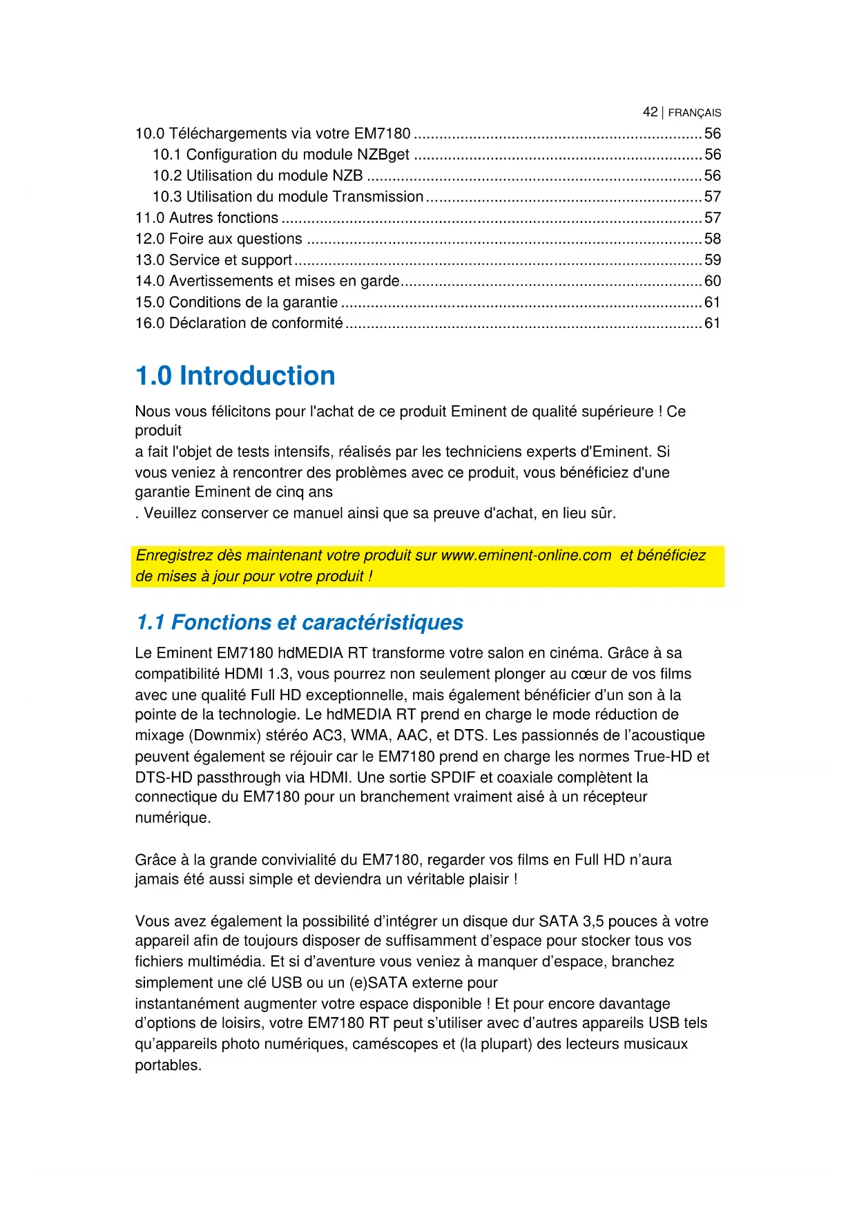 Pour assurer votre sécurité et la conformité du produit aux directives et lois de la Commission Européenne, vous pouvez obtenir une copie de la Déclaration de conformité de votre produit en envoyant un message e-mail à : info@eminent- online.com. Vous pouvez aussi nous écrire à l’adresse suivante : Eminent Computer Supplies P.O. Box 276 6160 AG Geleen Pays-Bas Indiquez clairement "Déclaration de conformité" et le code d'article du produit pour lequel vous voulez obtenir une copie de la Déclaration de conformité.62 | ESPAÑOL Reproductor multimedia HD EM7180 hdMEDIA Índice 1.0 Introducción ...........................................................................................................63