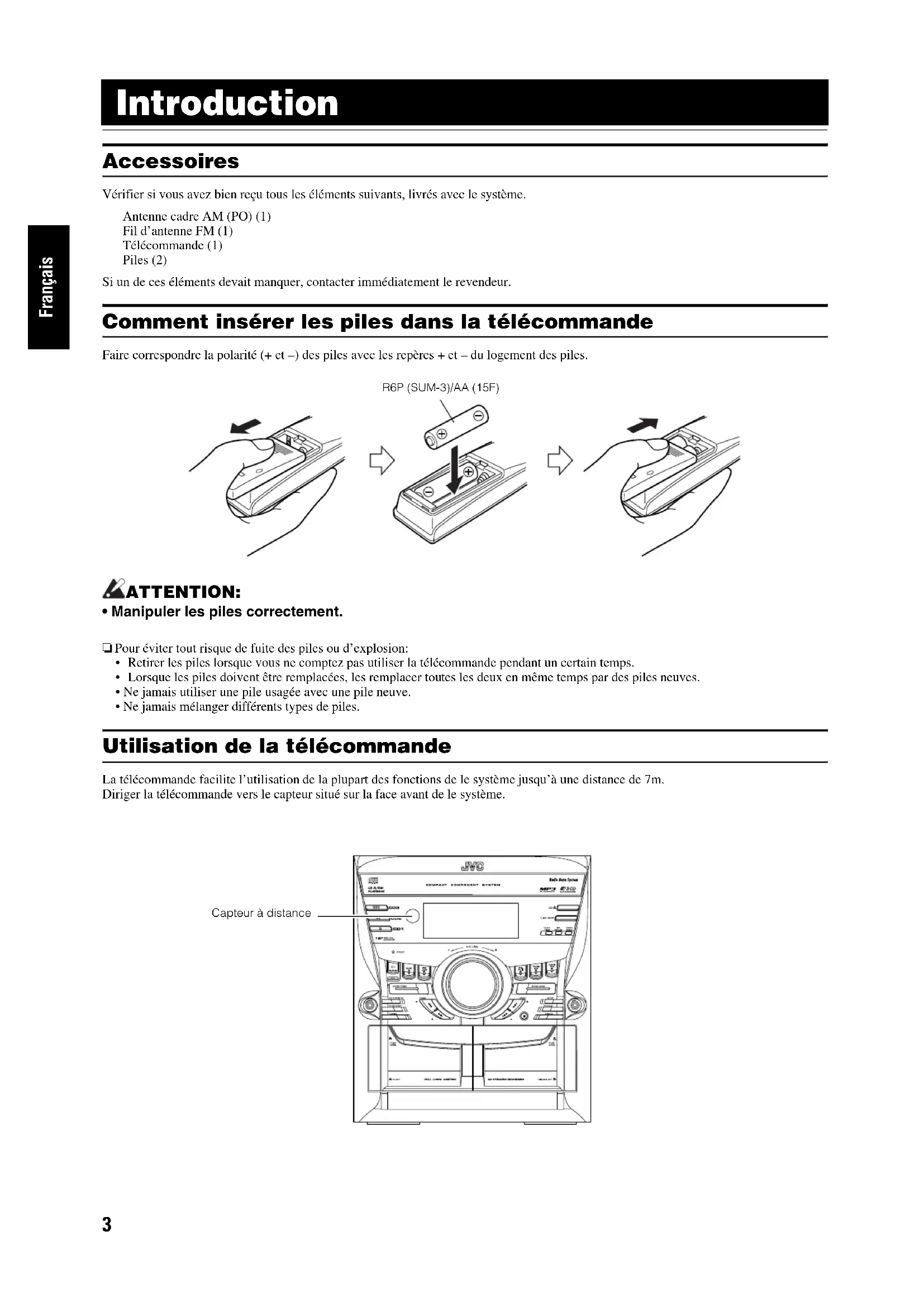 - Ne jamais utiliser une pile usagée avec une pile neuve.• Ne jamais mélanger différents types de piles. Utilisation de la télécommande La télécommande facilite l’utilisation de la plupart des fonctions de le système jusqu’à une distance de 7m. Diriger la télécommande vers le capteur situé sur la face avant de le système.R6P (SUM-3)/AA (15F)Capteur à distance MX-KC45(E)_FR.book Page 3 Thursday, April 6, 2006 6:43 PM4 Introduction Français ATTENTION: