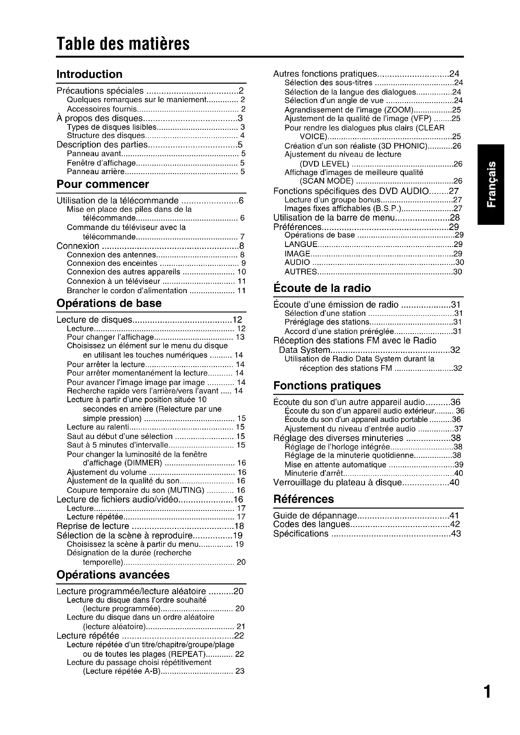 - Dans ce cas, mettez hors service la fonction QP Link ou arrêter la lecture sur l’appareil connecté à la prise AUX 1. Si la chaîne ne fonctionne pas correctement malgré les mesures correctives ci-dessus Beaucoup de fonctions de cette chaîne sont exécutées à partir de micro-ordinateurs. Si rien ne se produit quand vous appuyez sur n’importe quelle touche, débranchez la fiche du cordon d’alimentation de la prise murale, attendez un moment et rebranchez la chaîne. Code Langue Code LangueAA Afar MK MacédonienAB Abkhaze ML MalayalamAF Afrikaans MN MongolAM Amharique MO MoldaveAR Arabe MR MaratheAS Assamais MS Malais (MAY)AY Aymara MT MaltaisAZ Azerbaïdjanais MY BirmanBA Bachkir NA NauruBE Biélorusse NE NépalaisBG Bulgare NL NéerlandaisBH Bihari NO NorvégienBI Bichlamar OC OccitanBN Bengali, Bangla OM (Afan) GallaBO Tibétain OR OriyaBR Breton PA PendjabiCA Catalan PL PolonaisCO Corse PS Pachto, PushtoCS Tchèque PT PortugaisCY Gallois QU QuechuaDA Danois RM Rhéto-romanDZ Dzongkha RN Kirundi, rundiEL Grec RO RoumainEO Espéranto RW RwandaET Estonien SA SanskritEU Basque SD SindhiFA Perse SG SangoFI Finnois SH Serbo-CroateFJ Fidji SI SinghalaisFO Féroïen SK SlovaqueFY Frison SL SlovèneGA Irlandais SM SamoanGD Gaélique écossais SN ShonaGL Galicien SO SomaliGN Guarani SQ AlbanaisGU Goudjrati SR SerbeHA Haoussa SS SwatiHI Hindi ST SothoHR Croate SU SoudanaisHU Hongrois SV SuédoisHY Arménien SW Swahili IA Interlingua TA Tamoul IE Interlingue TE TélougouIK Inupiaq TG TadjikIN Indonésien TH ThaïIS Islandais TI TigrignaIW Hébreu TK Turkmène JI Yiddish TL Tagalog JW Javanais TN TswanaKA Géorgien TO TonganKK Kazakh TR TurcKL Groenlandais TS TsongaKM Cambodgien (khmer) TT TatarKN Kannada TW TwiKO Coréen (KOR) UK UkrainienKS Kashmiri UR OurdouKU Kurde UZ OuszbekKY Kirghize VI VietnamienLA Latin VO VolapükLN Lingala WO WolofLO Lao XH Xhosa LT Lituanien YO Yoruba LV Latvien, letton ZU ZoulouMG MalgacheMI Maori Guide de dépannage (suite) Codes des langues FS-XA1[B]-06.fm Page 42 Monday, April 24, 2006 9:10 AM43 Général Source d’alimentation:Secteur 230 V , 50 Hz Consommation: 25 W (en fonctionnement)/ 4,0 W (en mode d’attente/ affichage en service) 1,0 W (en mode d’attente/ affichage hors service) Poids: 2,6 kg Dimensions extérieures 150 mm x 152,6 mm x 252,9 mm (L x H x P): Lecteur de DVD Disques reproductibles:DVD VIDEO, DVD AUDIO,