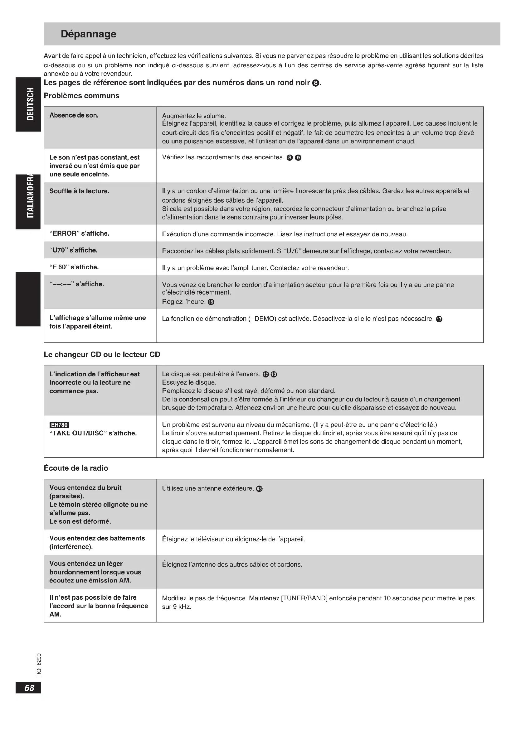 s’affiche pendant le montage à une touche. Nettoyez les têtes. u Vérifiez le réglage de la réduction de bruit Dolby. O Si les languettes de protection contre l’effacement ont été retirées, recouvrez les orifices avec du ruban adhésif. _ Insérez une cassette dans la platine 2. _ Si les languettes de protection contre l’effacement ont été retirées, recouvrez les orifices avec du ruban adhésif. _ Lorsqu’il y a un téléviseur à proximité L’image du téléviseur disparaît ou des bandes apparaissent sur l’écran. La position ou l’orientation de l’antenne est incorrecte. Si vous utilisez une antenne intérieure, changez-la pour une antenne extérieure. Le cordon d’antenne du téléviseur est trop près de l’appareil. Éloignez le cordon d’antenne du téléviseur de l’appareil. ³La bande des cassettes dont la durée excède 100 minutes est mince et peut se briser ou se coincer dans le mécanisme. ³Le mou de bande peut se coincer dans le mécanisme, aussi devrait-il être rembobiné avant la lecture de la cassette. ³Les cassettes à bande sans fin peuvent se coincer dans les pièces mo- biles de la platine si elles ne sont pas utilisées de la bonne façon. Utilisez des cassettes qui conviennent au mécanisme d’inversion automatique de cet appareil. Position Normal/Type I 4 Position High//Type II 4 Position Métal/Type IV 4 L’appareil peut faire correctement la lecture ou l’enregistrement des types de cassettes suivants. Il identifie automatiquement le type. Soin et choix des cassettes70 RQT6299 DANSK DEUTSCH ITALIANOFRANÇAIS Umspulzeit ca. 110 Sekunden mit C-60-Cassette Frequenzgang (DOLBY NR Aus) TYP I (NORMAL) 20 Hz–16 kHz (nach DIN) TYP II (HIGH) 20 Hz–16 kHz (nach DIN) TYP IV (METAL) 20 Hz–16 kHz (nach DIN) Signal-Rauschabstand (SignalpegelKmax. Aufnahmepegel, TYP II-Band) NR Aus 56 dB (A-Bewertung) DOLBY B NR Ein 66 dB (A-Bewertung) Eingangsempfindlichkeit und -impedanz REC (IN) 150 mV/23 k Ausgangsspannung und -impedanz PLAY (OUT) 280 mV/360 º Allgemeine Daten Abmessungen (BtHtT) 294k118,5k281 mm Gewicht 2,1 kC VORDERER LAUTSPRECHER Bauart 3-Wege-System, 3 Lautsprecher, Bassreflex-Ausführung Lautsprecher Supertieftöner [EH780] [EH580] 17-cm-Konustyp Tieftöner [EH780] [EH580] 12-cm-Konustyp [EH680] 17-cm-Konustyp Mitteltöner [EH680] 12-cm-Konustyp Hochtöner [EH780] 6-cm-Kalottentyp, ringförmig [EH680] [EH580] 6-cm-Konustyp Impedanz [EH780] [EH580] HIGH 6 , LOW 8 [EH680] 6 Belastbarkeit (Musikleistung) [EH780] [EH580]