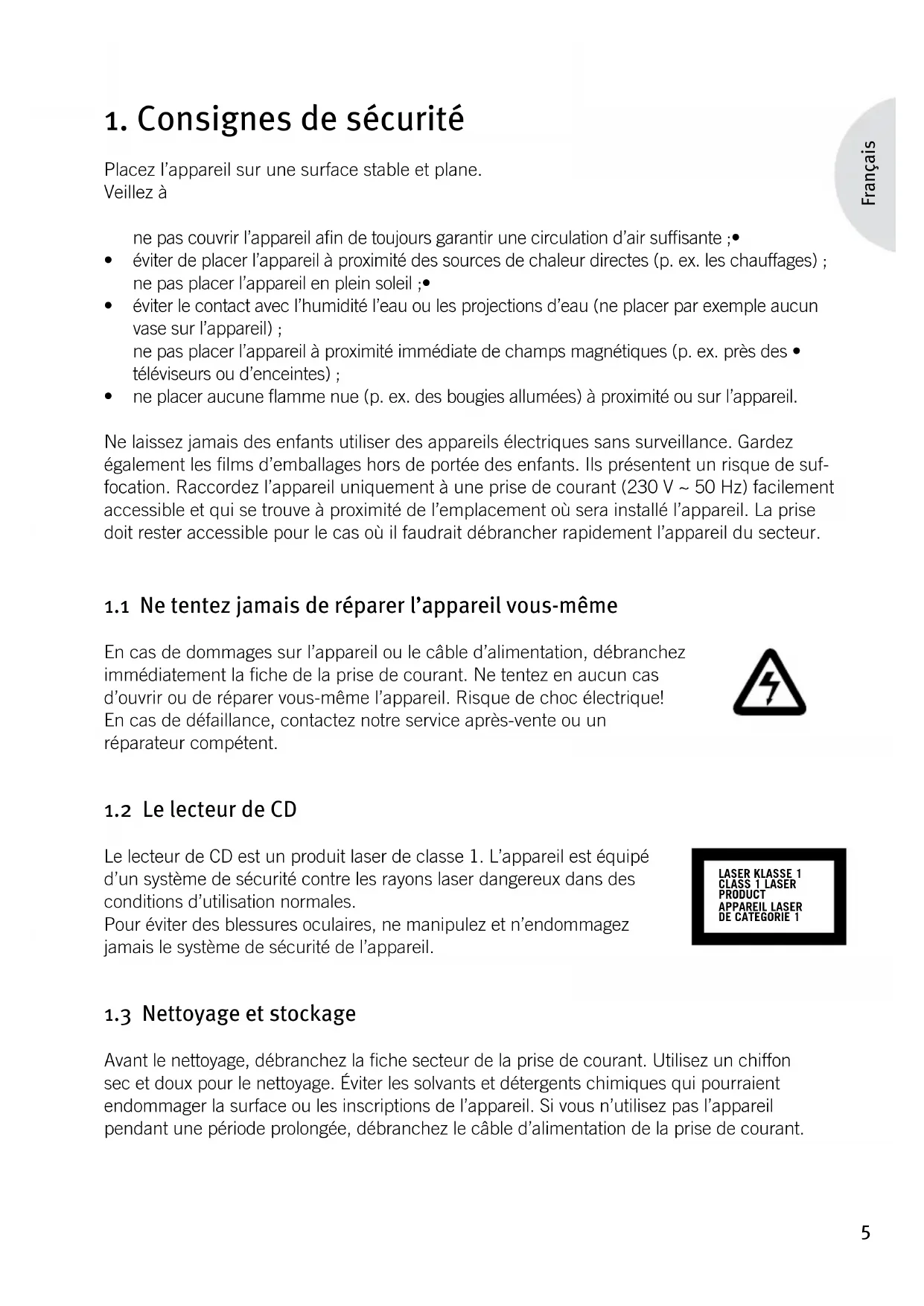1.1 Ne tentez jamais de réparer l’appareil vous-même