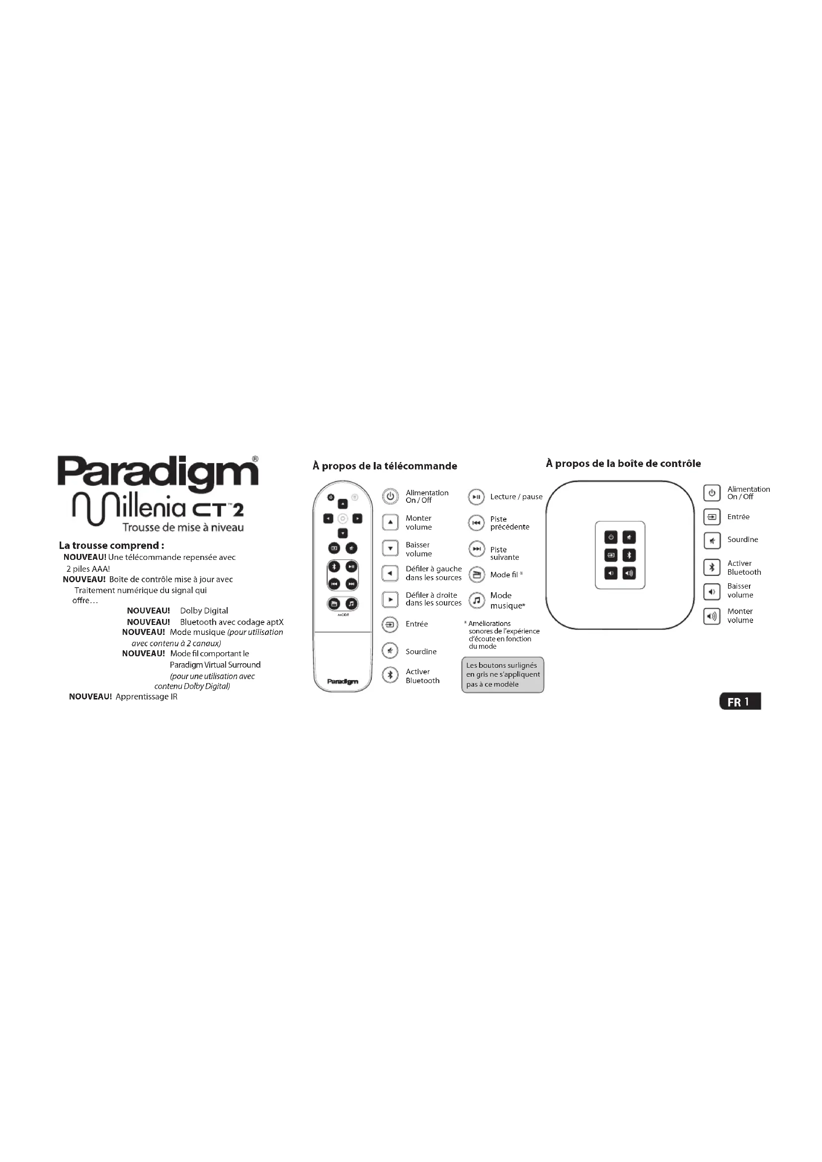 4ENEN NOTES 5La trousse comprend : NOUVEAU! Une télécommande repensée avec 2 piles AAA! NOUVEAU! Boîte de contrôle mise à jour avec Traitement numérique du signal qui ore… NOUVEAU! Dolby Digital NOUVEAU! Bluetooth avec codage aptX NOUVEAU! Mode musique (pour utilisation avec contenu à 2 canaux) NOUVEAU! Mode l comportant le Paradigm Virtual Surround (pour une utilisation avec contenu Dolby Digital) NOUVEAU! Apprentissage IR EntréeAlimentation On / Off Baisser volume Monter volume Activer Bluetooth Sourdine À propos de la boîte de contrôle MODE À propos de la télécommande Alimentation On / Off Baisser volume Monter volume Activer Bluetooth Lecture / pauseSourdineEntréeMode fil *Piste suivantePiste précédente Mode musique