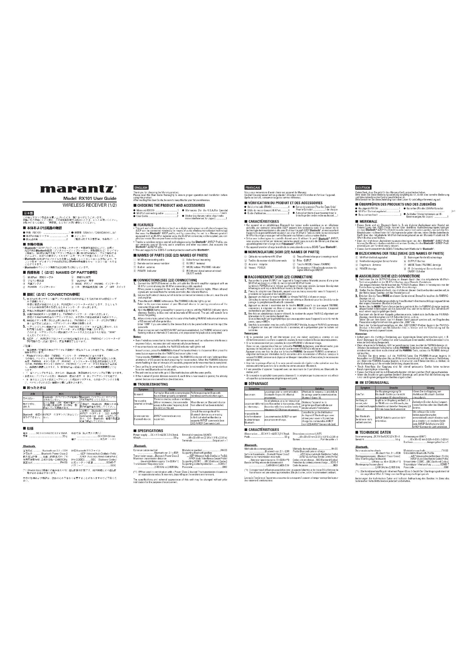 Si la connexion sans fil est interrompue pour une raison quelconque, comme en cas d’interférences radio ou d’une coupure de courant, la reconnexion s’effectue automatiquement.• Si la reconnexion n’est pas possible, le voyant PAIRING s’allume en rouge. Dans ce cas, appuyez deux fois sur la touche PAIRING du berceau pour déconnecter, puis appuyez de nouveau sur la touche afin que le voyant PAIRING s’allume en rouge. Appuyez alors une fois de plus sur la touche PAIRING. Le voyant PAIRING commence à clignoter en bleu par intervalles de 0,5 secondes et la reconnexion s’effectue. Lorsque le voyant PAIRING commence à clignoter en bleu par intervalles de 5 secondes, la reconnexion est terminée.• Une fois le pairage effectué, il ne sera pas nécessaire de répéter cette opération avec les mêmes périphériques lors de la prochaine communication Bluetooth.• Il est possible d’appairer l’appareil avec un maximum de 8 périphériques Bluetooth de même profil.• Si le nombre de périphériques pairés dépasse 8, le périphérique le plus ancien est effacé chaque fois qu’un nouveau périphérique est pairé. 7 DÉPANNAGE Symptôme Cause SolutionAucun sonLe pairage pour la communication Bluetooth n’a pas été effectué proprement.Effectuez de nouveau la procédure de pairage pour la communication Bluetooth (sans fil).Le son est déformé ou interrompu.Un périphérique, tel qu’un réseau local sans fil ou un four à micro-ondes, utilise des ondes radio dans la même bande de fréquences (2,4 GHz) que cet appareil.Déplacez l’appareil ou le périphérique Bluetooth de son emplacement d’installation.Impossible de faire fonctionner le périphérique Bluetooth.Les commandes AVRCP ne sont pas prises en charge.Consultez le guide d’utilisateur du dispositif Bluetooth que vous utilisez pour savoir s'il prend en charge les commandes AVRCP (voir (2/2) AVRCP Commands List). 7 CARACTÉRISTIQUES Alimentation .......DC 5 V 3 mA/DC 3,3 V 35mA Poids ............................................................. 55 g Dimensions externes (L/H/P) ....60 x 30 x 60 mm (2-3/8 x 1-3/16 x 2-3/8 in)Bornes ....................................Port de sortie × 1 Bluetooth Méthode de communication .............................Bluetooth ver. 2.1 + EDRSortie de transmission ....Bluetooth Power Class 2Distance de transmission maximale ...Distance en ligne de vue approx. 10 m (32,8ft.) (*1)Bande de fréquences de transmission ...............................2,400 GHz à 2,4835 GHzMéthode de modulation .........................FH-SSProfils Bluetooth pris en charge ......A2DP (Advanced Audio Distribution Profile), AVRCP (Audio Video Remote Control Profile)Codec pris en charge .. SBC (Subband Codec)Protection du contenu prise en charge .... SCMS-TCode de passe .............................................0000(*1)(Lorsque vous l'utilisez en association avec un appareil électrique de classe 2) La distance de transmission est une valeur approximative. Elle peut varier, selon l’environnement ambiant.Les spécifications et l’apparence externe de cet appareil peuvent changer sans préavis pour des raisons d’améliorations. DEUTSCH Vielen Dank, dass Sie sich für das Marantz-Gerät entschieden haben.Bitte lesen Sie diese Bedienungsanleitung sorgfältig durch, damit eine korrekte Bedienung und Inbetriebnahme des Geräts gewährleistet ist.Bitte bewahren Sie diese Anleitung nach dem Lesen für zukünftige Verwendung auf. 7 ÜBERPRÜFEN DES PRODUKTS UND DES ZUBEHÖRS 0 Hauptgerät (RX101) ...................................10 M-XPort-Verbindungskabel.......................10 Benutzerhandbuch ......................................20 Garantien (Für die USA/Für Kanada) ...................................................... je 10 Aufkleber (Vorsichtshinweis zu HF-Einstreuungen, für Japan) .......................1 7 MERKMALE