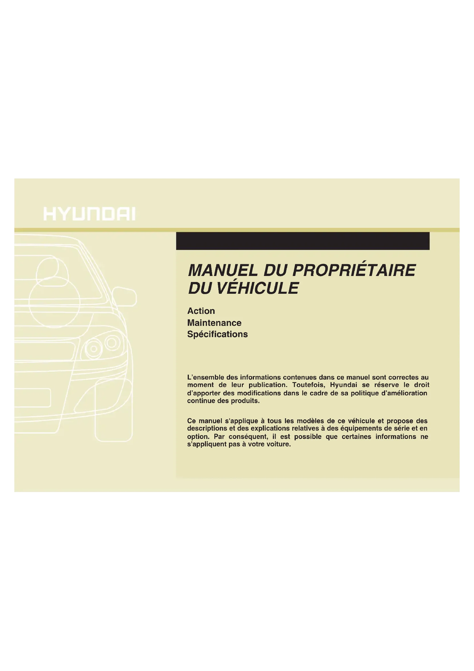 L’ensemble des informations contenues dans ce manuel sont correctes au moment de leur publication. Toutefois, Hyundai se réserve le droit d’apporter des modifications dans le cadre de sa politique d’amélioration continue des produits. Ce manuel s'applique à tous les modèles de ce véhicule et propose des descriptions et des explications relatives à des équipements de série et en option. Par conséquent, il est possible que certaines informations ne s'appliquent pas à votre voiture.
