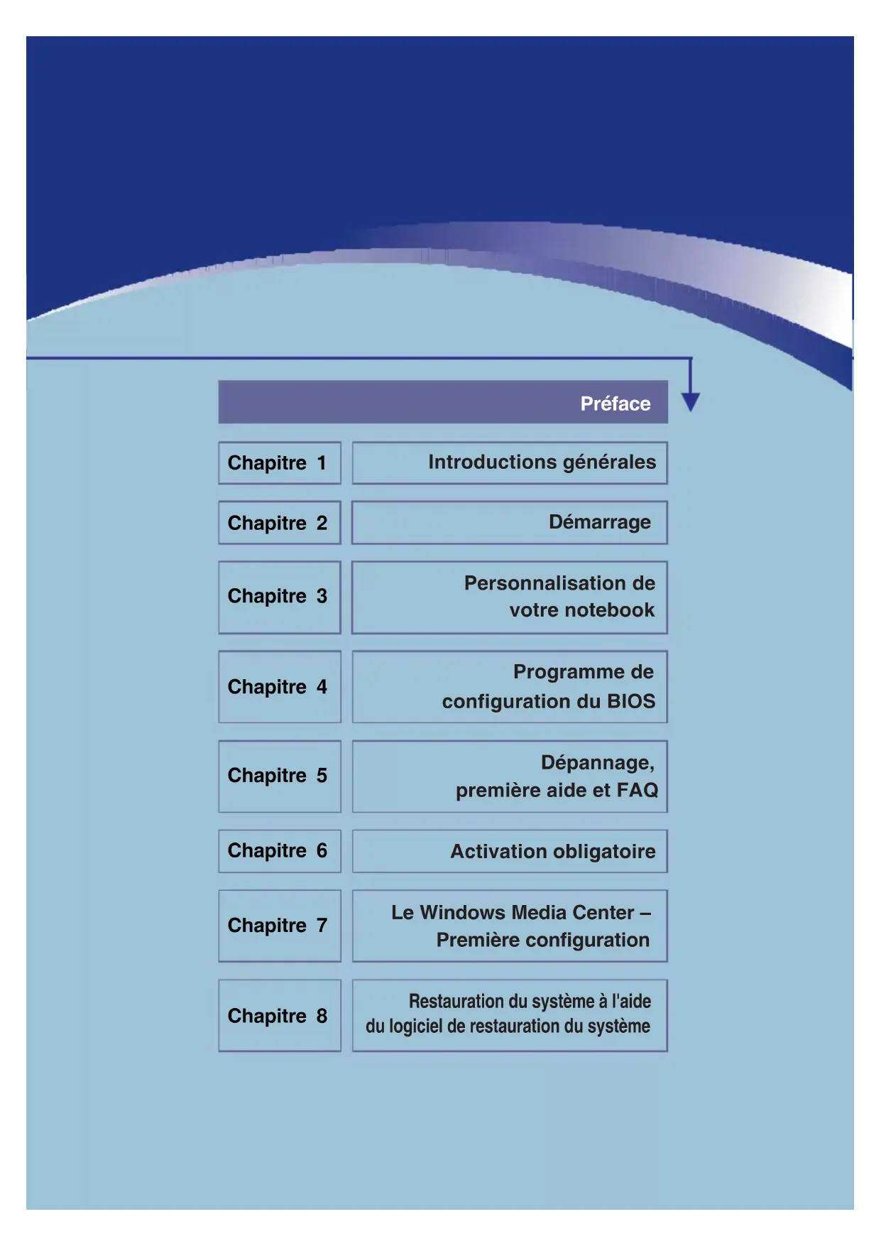 Programme de configuration du BIOS Dépannage, première aide et FAQ Activation obligatoire Le Windows Media Center – Première configuration Personnalisation de votre notebook Restauration du système à l'aide du logiciel de restauration du système