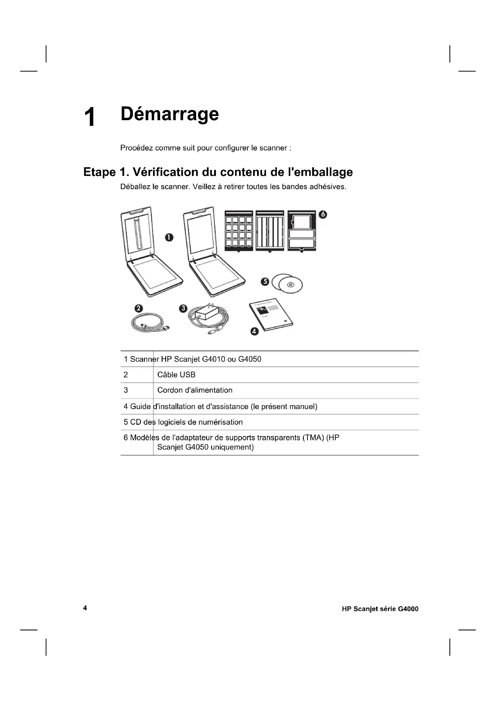 Cordon d'alimentation 4 Guide d'installation et d'assistance (le présent manuel) 5 CD des logiciels de numérisation 6 Modèles de l'adaptateur de supports transparents (TMA) (HP Scanjet G4050 uniquement)