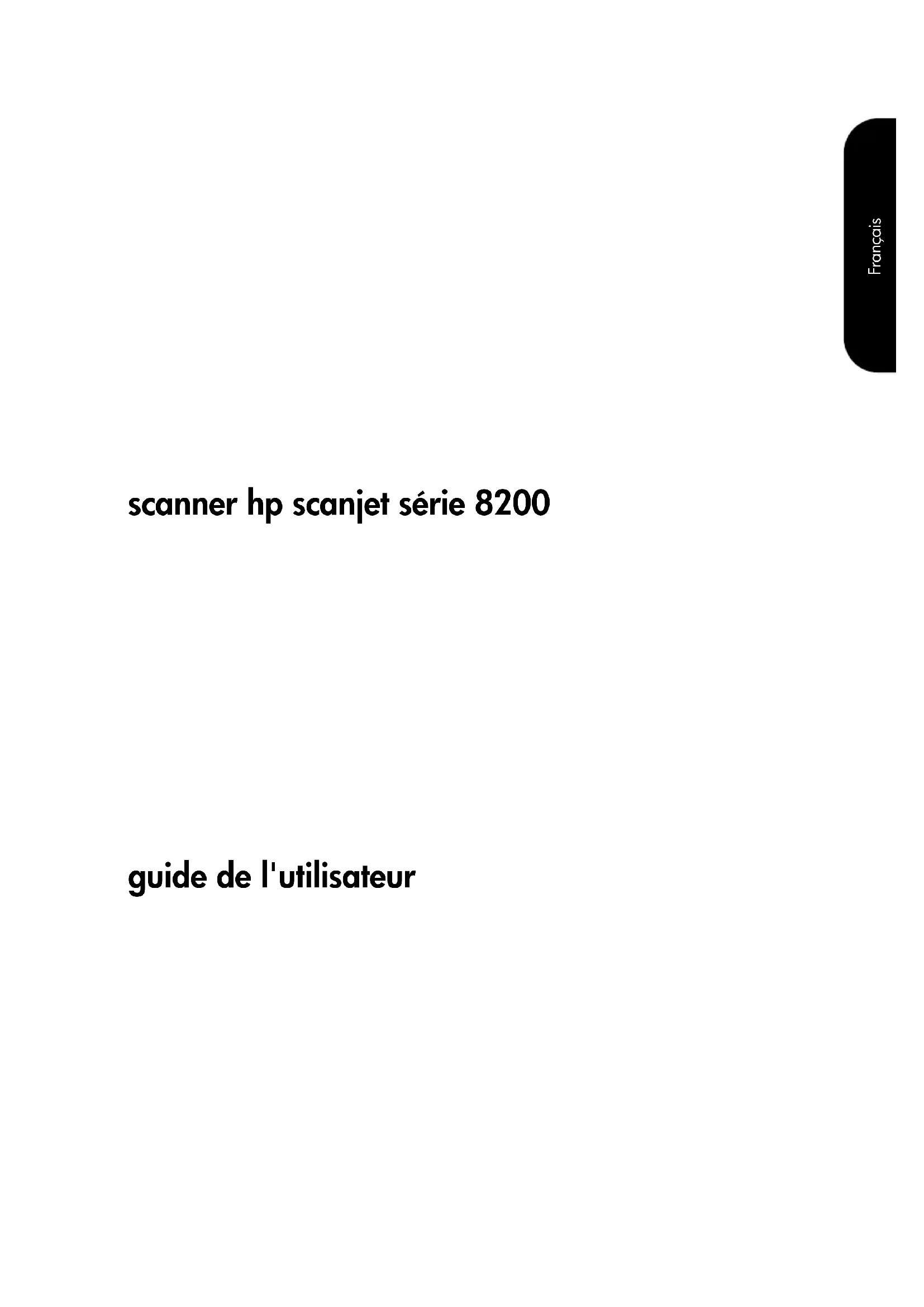 guide de l'utilisateur gebruikers- handleiding scanner hp scanjet série 8200 hp scanjet 8200 series scannersscanner hp scanjet série 8200 guide de l'utilisateur FrançaisCopyright © Copyright Hewlett-Packard Company 2003 Tous droits réservés. La reproduction, l'adaptation ou la traduction de ce document dans une autre langue sans l’autorisation écrite préalable de Hewlett-Packard est interdite, ou autorisée conformément aux lois relatives au copyright. Ce produit intègre la technologie PDF de Adobe, qui inclut la compression LZW (Lempel- Ziv-Welch), brevet déposé sous le numéro US Patent 4,558,302. marques déposées Adobe et le logo Acrobat sont des marques commerciales ou des marques déposées de Adobe Systems Incorporated aux Etats-Unis et dans d'autres pays/régions. Energy Star® est une marque déposée aux Etats-Unis de l'agence américaine de protection de l'environnement (United States Environmental Protection Agency. Microsoft et Windows sont des marques déposées de Microsoft Corporation. Il se peut que les autres noms de produits mentionnés soient des marques déposées de leurs détenteurs respectifs. garantie Les informations contenues dans ce document sont sujettes à modification sans préavis. Hewlett-Packard n'offre aucune garantie d'aucune sorte sur ces informations.