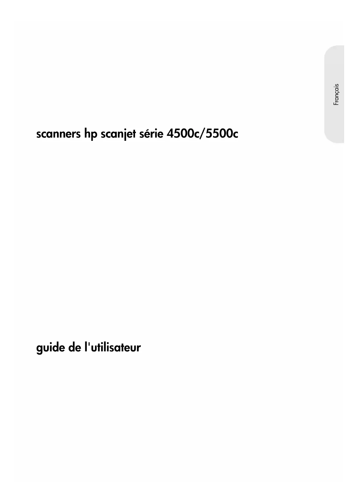 guide de l'utilisateur gebruikers- handleiding scanners hp scanjet série 4500c/5500c hp scanjet- scanners serie 4500c en 5500cscanners hp scanjet série 4500c/5500c guide de l'utilisateur Français P_usermanual1.book Page 1 Vendredi, 3. mai 2002 10:29 10Copyright © Copyright Hewlett-Packard Company 2002 Tous droits réservés. La reproduction, l'adaptation ou la traduction de ce document dans une autre langue sans l’autorisation écrite préalable de Hewlett-Packard est interdite, ou autorisée conformément aux lois relatives au copyright. Ce produit intègre la technologie PDF de Adobe, qui inclut l'utilisation de LZW, produit sous licence U.S. Patent 4,558,302. Marques déposées Adobe et le logo Acrobat sont des appellations commerciales ou des marques déposées de Adobe Systems Incorporated aux Etats-Unis et/ou dans d'autres pays/régions. Microsoft et Windows sont des marques déposées de Microsoft Corporation. Il se peut que les autres noms de produits mentionnés soient des marques déposées de leurs détenteurs respectifs. Garantie Les informations contenues dans ce document sont sujettes à modification sans préavis. Hewlett-Packard n'offre aucune garantie d'aucune sorte sur ces informations. HEWLETT- PACKARD REJETTE SPECIFIQUEMENT TOUTES GARANTIES DE COMMERCIALISATION ET D'ADAPTATION A UN USAGE PARTICULIER. Hewlett-Packard ne pourra être tenu pour responsable des dommages directs, indirects ou accidentels liés à la fourniture ou à l'utilisation des informations contenues dans ce document. L'application TWAIN est distribué en l'état. Les développeurs et les distributeurs de l'application TWAIN rejettent expressément toute garantie implicite, expresse ou réglementaire, y compris, et sans aucune limitation, les garanties implicites de commercialisation, de respect des droits des tiers et d'adaptation à un usage particulier. Ni les développeurs, ni les distributeurs ne seront tenus responsables des dommages directs, indirects, spéciaux, fortuits ou consécutifs qui résulteraient de la reproduction, de la modification, de la distribution ou d'une autre utilisation de l'application TWAIN. NOTICE TO U.S. GOVERNMENT USERS: RESTRICTED RIGHTS COMMERCIAL COMPUTER SOFTWARE: “Use, duplication, or disclosure by the Government is subject to restrictions as set forth in subparagraph (c) (1) (ii) of the Rights in Technical Data Clause at DFARS 52.227- 7013.” Il se peut que les documents numérisés à l'aide de ce produit soient protégés par la législation du gouvernement ou par d'autres réglementations, telles que les lois relatives au copyright. Le respect de ces réglementations relève de la responsabilité exclusive du client. Mise au rebut de certains matériaux Ce produit HP contient des matériaux qui risquent de nécessiter un traitement spécial lorsqu'ils seront hors d'usage :