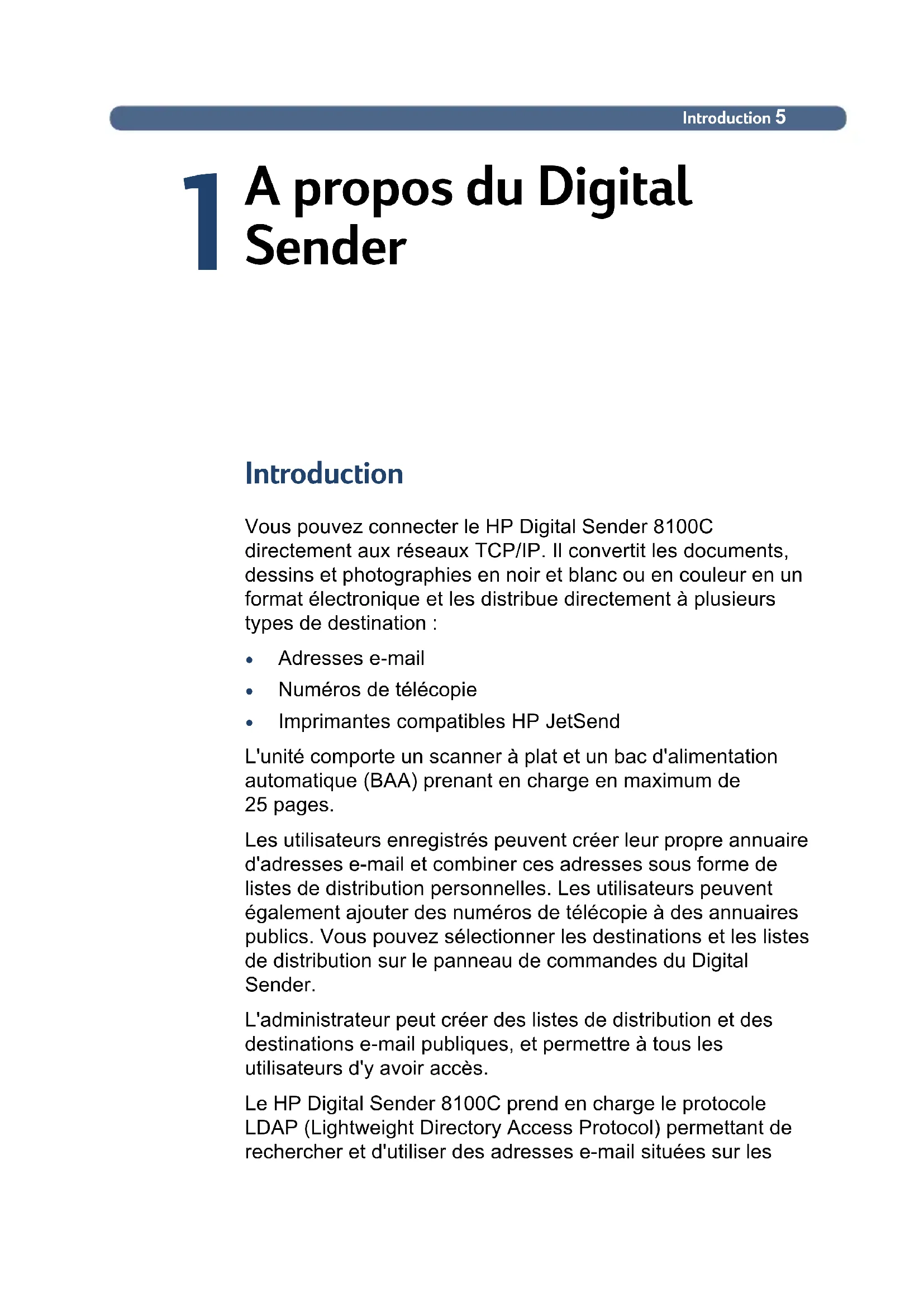 A propos du Digital Sender Introduction Vous pouvez connecter le HP Digital Sender 8100C directement aux réseaux TCP/IP. Il convertit les documents, dessins et photographies en noir et blanc ou en couleur en un format électronique et les distribue directement à plusieurs types de destination :
