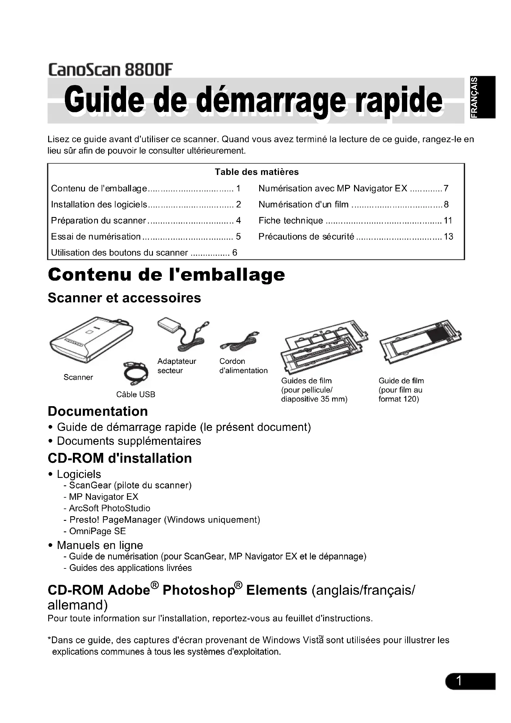 - Elements (anglais/français/ allemand) Pour toute information sur l'installation, reportez-vous au feuillet d'instructions.*Dans ce guide, des captures d'écran provenant de Windows Vista sont utilisées pour illustrer les explications communes à tous les systèmes d'exploitation.Table des matières Contenu de l'emballage p. 1