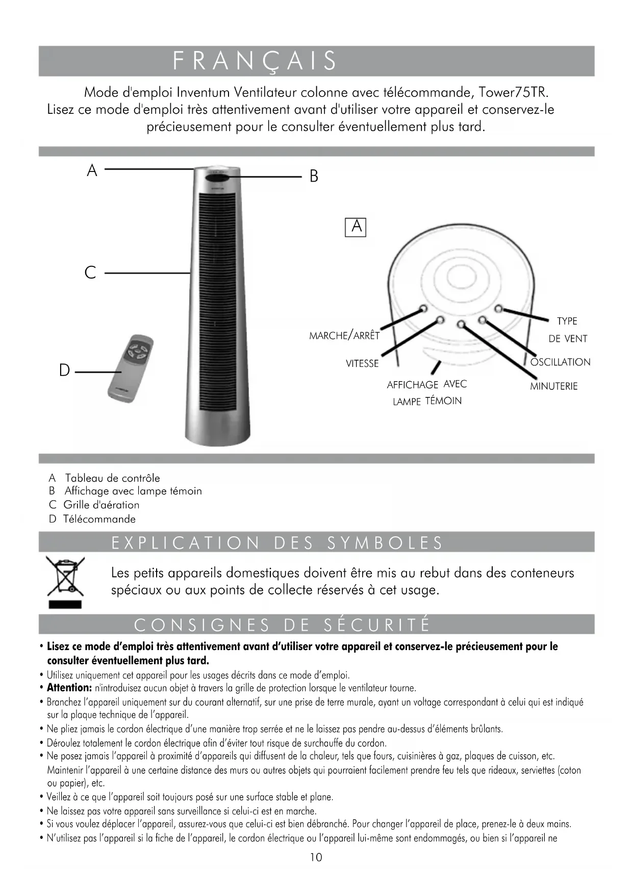 - N’utilisez pas l’appareil si la fiche de l’appareil, le cordon électrique ou l’appareil lui-même sont endommagés, ou bien si l’appareil ne F R A N Ç A I S Mode d'emploi Inventum Ventilateur colonne avec télécommande, Tower75TR. Lisez ce mode d'emploi très attentivement avant d'utiliser votre appareil et conservez-le précieusement pour le consulter éventuellement plus tard. C O N S I G N E S D E S É C U R I T É A Tableau de contrôle B Affichage avec lampe témoin C Grille d'aération D Télécommande E X P L I C A T I O N D E S S Y M B O L E S Les petits appareils domestiques doivent être mis au rebut dans des conteneurs spéciaux ou aux points de collecte réservés à cet usage.